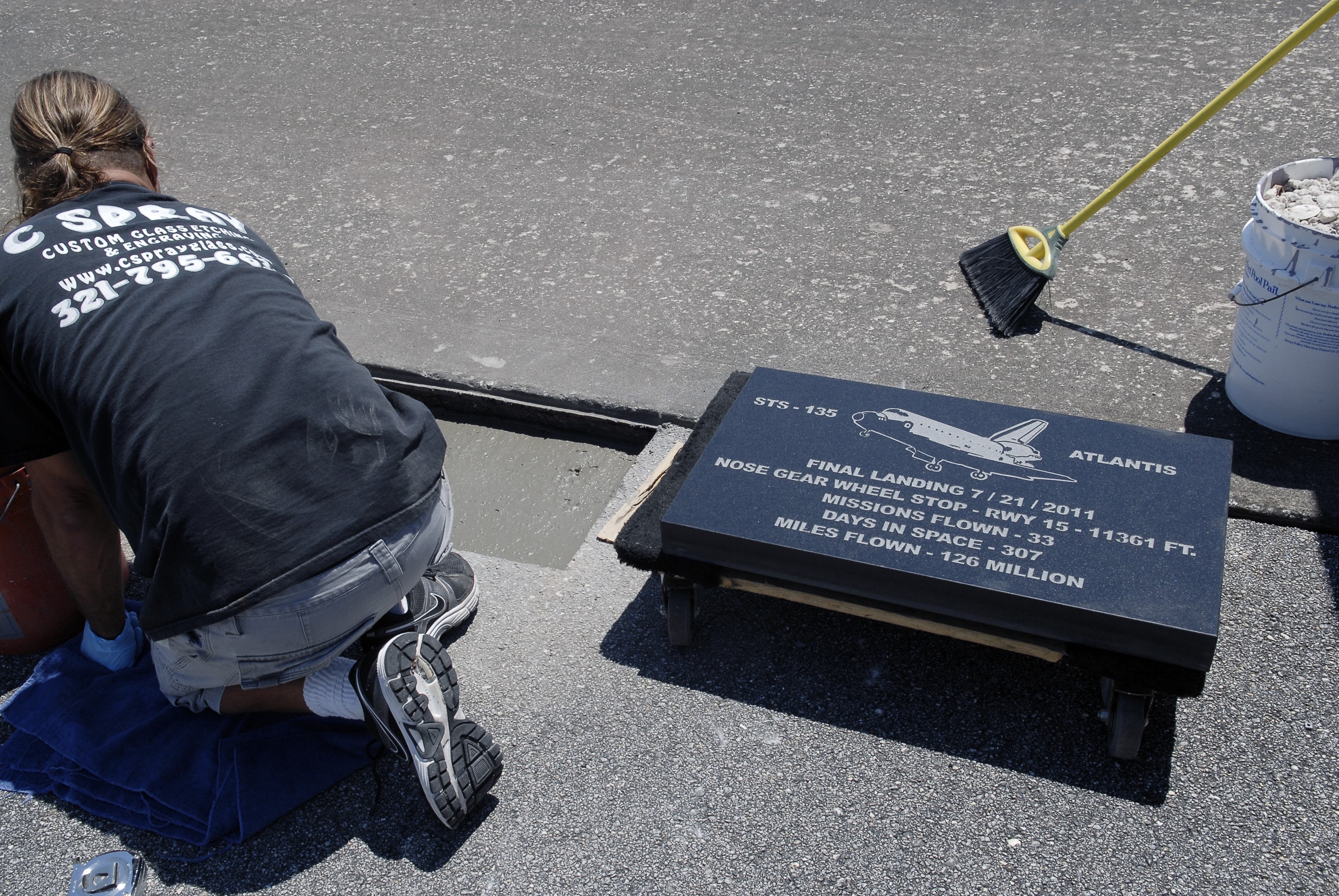 CAPE CANAVERAL, Fla. - At the Shuttle Landing Facility SLF at NASA’s Kennedy Space Center in Florida, Chad Stout with C Spray Glass Blasting in Cocoa, Fla., prepares to install a special plaque to mark the nose gear wheel stop of space shuttle Atlantis. The black granite plaque, which is 16 by 28 inches, is the third plaque permanently mounted to commemorate the final landing of each of the three orbiters. Atlantis completed the STS-135 mission by landing at the SLF on July 21, 2011, at 5:57 a.m. Atlantis flew 33 missions, completed 4,848 orbits of the Earth, traveled nearly 126 million miles and spent 307 days in space. Atlantis carried 207 astronauts to space. Photo credit: NASA/Charisse Nahser