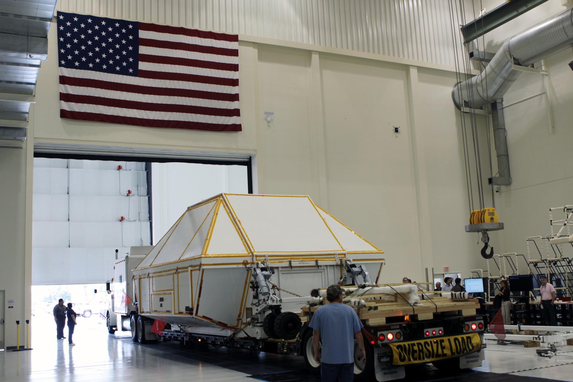 CAPE CANAVERAL, Fla. - The Orion crew module, packed inside a transportation canister, arrives inside the high bay of the Operations and Checkout Building at NASA's Kennedy Space Center in Florida. Slated for Exploration Flight Test-1, an uncrewed mission planned for 2014, the capsule will travel farther into space than any human spacecraft has gone in more than 40 years. NASA's Michoud Assembly Facility in New Orleans built the crew module pressure vessel. The Orion production team will prepare the module for flight by installing heat-shielding thermal protection systems, avionics and other subsystems. For more information, visit http://www.nasa.gov/orion. Photo credit: NASA/Jim Grossmann