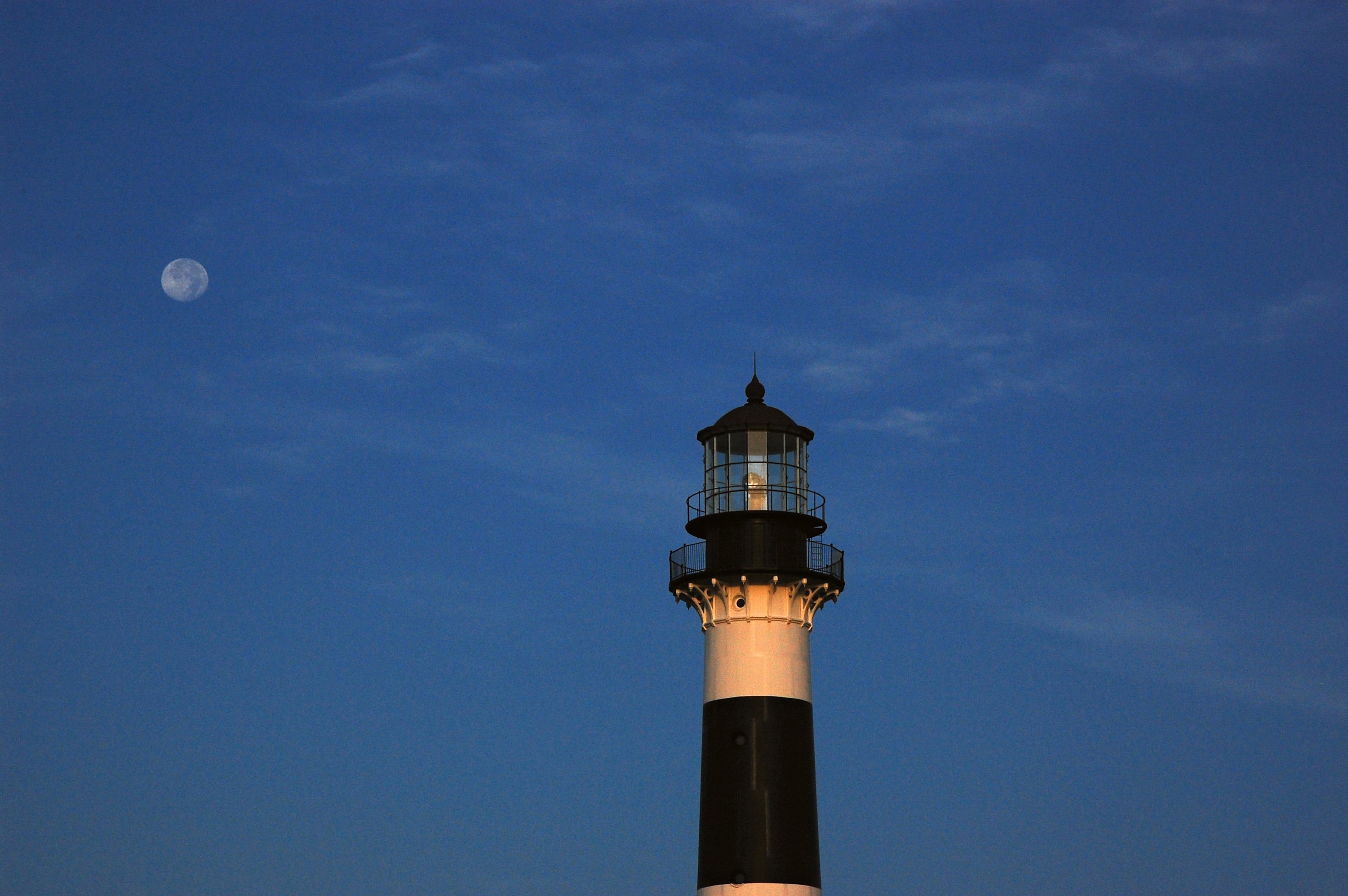 Cape Canaveral Air Force Station, Fla. -- The lantern room of the Cape Canaveral Lighthouse, with its modern first-order optic, takes on a warm glow as dawn breaks and a full moon still shines overhead. The Canaveral light is the only operating lighthouse owned by the U.S. Air Force. In 2000, the Coast Guard transferred ownership of the lighthouse structure and its grounds to the Air Force, which is now responsible for maintaining it. The U.S. Coast Guard continues to operate the beacon as an active navigational aid. The first lighthouse at Cape Canaveral was built near the tip of the Cape in 1848. The structure was only about 60 feet high with a rather dim light powered by whale oil. In 1859, work began nearby on a new, taller iron structure. Construction was halted during the Civil War, and the lighthouse finally was finished in 1868. The structure, with a brick lining inside its iron exterior, was painted with its "daymark" black and white horizontal bands in 1873 to make it easier to identify during the day as a navigation point. Between 1892 and 1894, the lighthouse was dismantled and moved to its new home about a mile from the coast, where it stands today. Photo credit: NASA/Ben Smegelsky