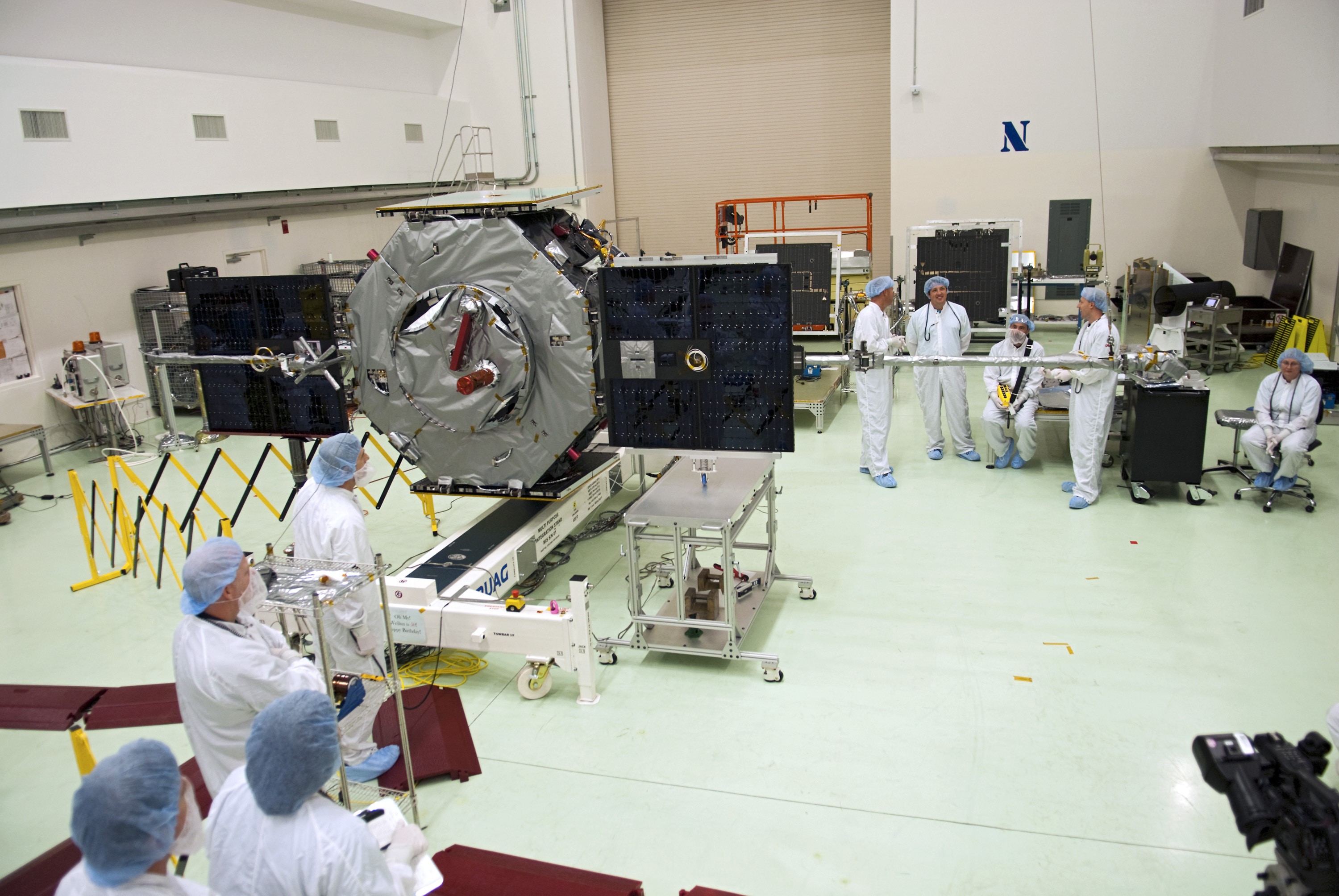 CAPE CANAVERAL, Fla. - Inside the Astrotech payload processing facility near NASA’s Kennedy Space Center in Florida, technicians deploy the solar arrays and magnetometer boom of the Radiation Belt Storm Probes, or RBSP, spacecraft A. Deploying these components is standard procedure to ensure they work properly on Earth before they head into space. NASA’s RBSP mission will help us understand the sun’s influence on Earth and near-Earth space by studying the Earth’s radiation belts on various scales of space and time. As the spacecraft orbits Earth, the four solar panels will continuously face the sun to provide constant power to its instruments. The boom will provide data of the electric fields that energize radiation particles and modify the structure of the inner magnetosphere. RBSP will begin its mission of exploration of Earth’s Van Allen radiation belts and the extremes of space weather after its launch aboard a United Launch Alliance Atlas V rocket. Launch is targeted for Aug. 23. For more information, visit http://www.nasa.gov/rbsp. Photo credit: NASA/Charisse Nahser