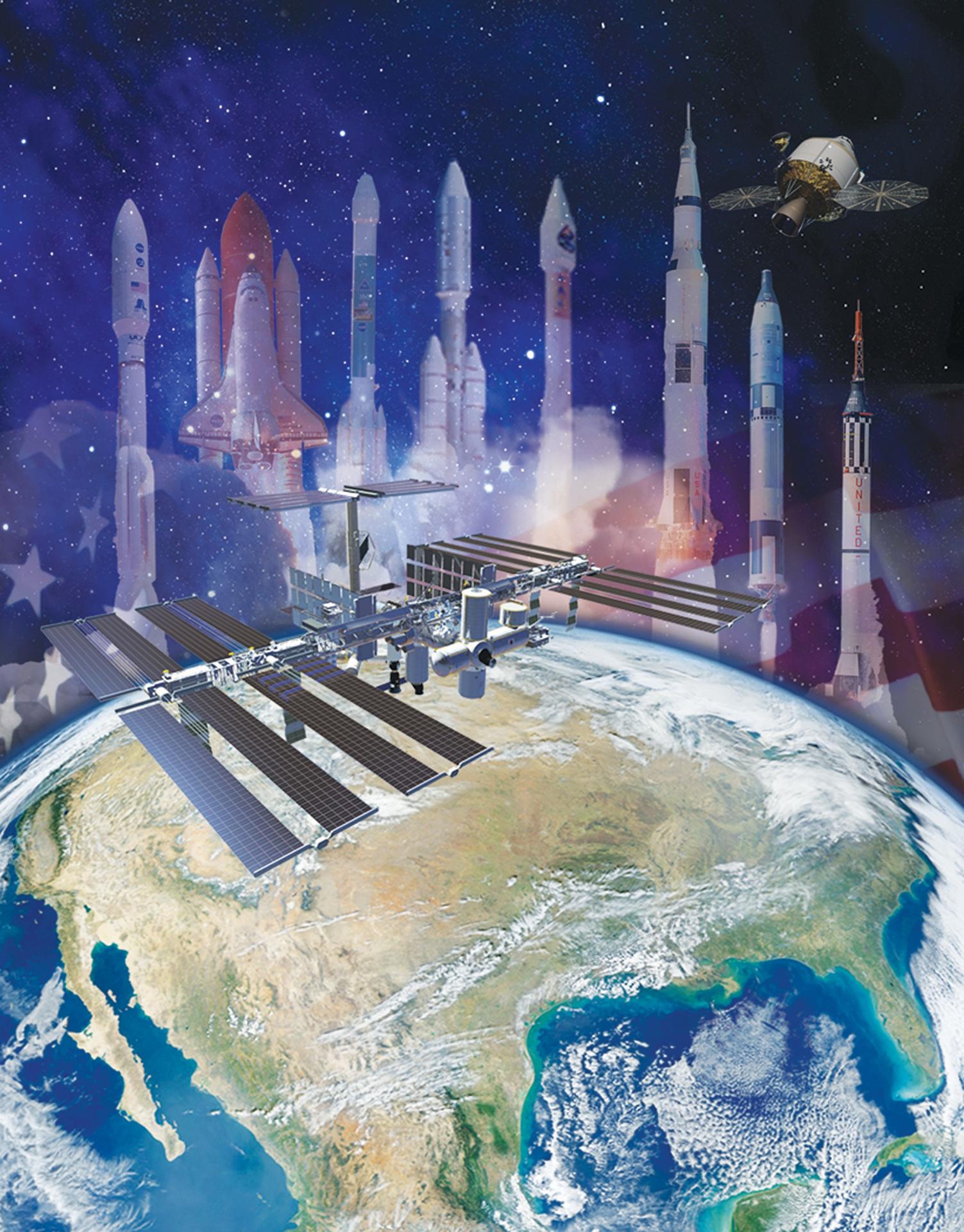 CAPE CANAVERAL, Fla. - Throughout the past 50 years, NASA's Kennedy Space Center has carried on America's legacy of processing, testing and launching a wide array of rockets and spacecraft to distant planets and other destinations in space. Launch vehicles, from left, include the Atlas V, the space shuttle, the Delta II, the Titan IV, the Atlas II, the Apollo Saturn V, the Gemini Titan and the Mercury Redstone. In the foreground are human destinations the center helped NASA reach, including Earth's orbit and the International Space Station. At the top right is NASA's newest spacecraft, the Orion multi-purpose crew vehicle, which will help humans explore deeper into space than ever before. Image credit: NASA