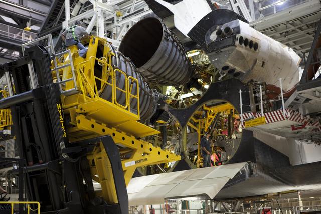 CAPE CANAVERAL, Fla. – In Orbiter Processing Facility Bay 2 at NASA’s Kennedy Space Center in Florida, technicians move the Hyster forklift into position for installation of replica shuttle main engine RSME number 3 on the space shuttle Endeavour. The work is part of Transition and Retirement of the remaining space shuttles, Endeavour and Atlantis. Endeavour is being prepared for public display at the California Science Center in Los Angeles. Its ferry flight to California is targeted for mid-September. Endeavour was the last space shuttle added to NASA’s orbiter fleet. Over the course of its 19-year career, Endeavour spent 299 days in space during 25 missions. For more information, visit http://www.nasa.gov/transition Photo credit: NASA/ Dimitri Gerondidakis