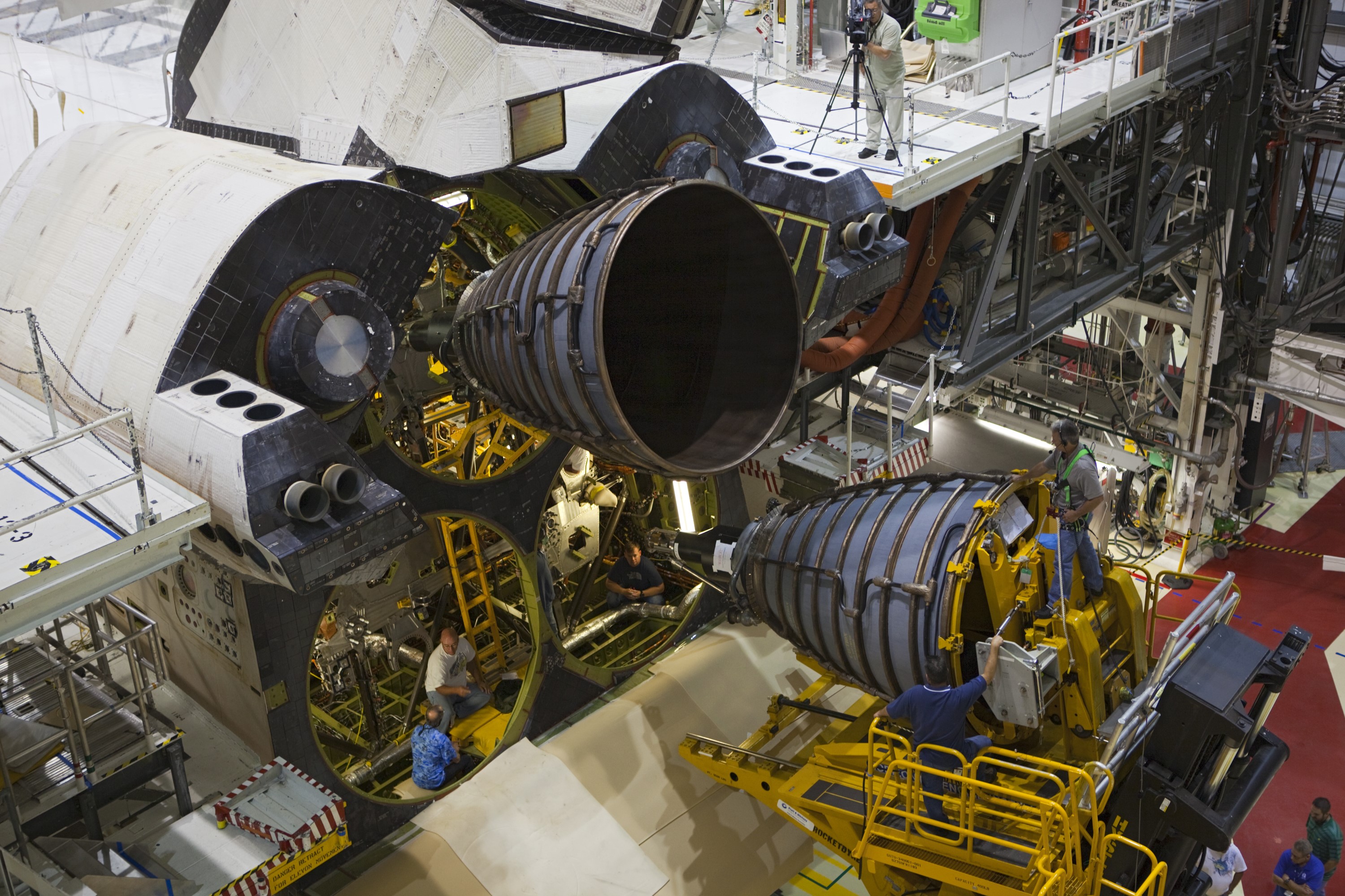 CAPE CANAVERAL, Fla. – In an overhead view, technicians work inside the aft compartment of the space shuttle Endeavour during installation of replica shuttle main engine RSME number 3 in Orbiter Processing Facility Bay 2 at NASA’s Kennedy Space Center in Florida. The work is part of Transition and Retirement of the remaining space shuttles, Endeavour and Atlantis. Endeavour is being prepared for public display at the California Science Center in Los Angeles. Its ferry flight to California is targeted for mid-September. Endeavour was the last space shuttle added to NASA’s orbiter fleet. Over the course of its 19-year career, Endeavour spent 299 days in space during 25 missions. For more information, visit http://www.nasa.gov/transition Photo credit: NASA/ Dimitri Gerondidakis
