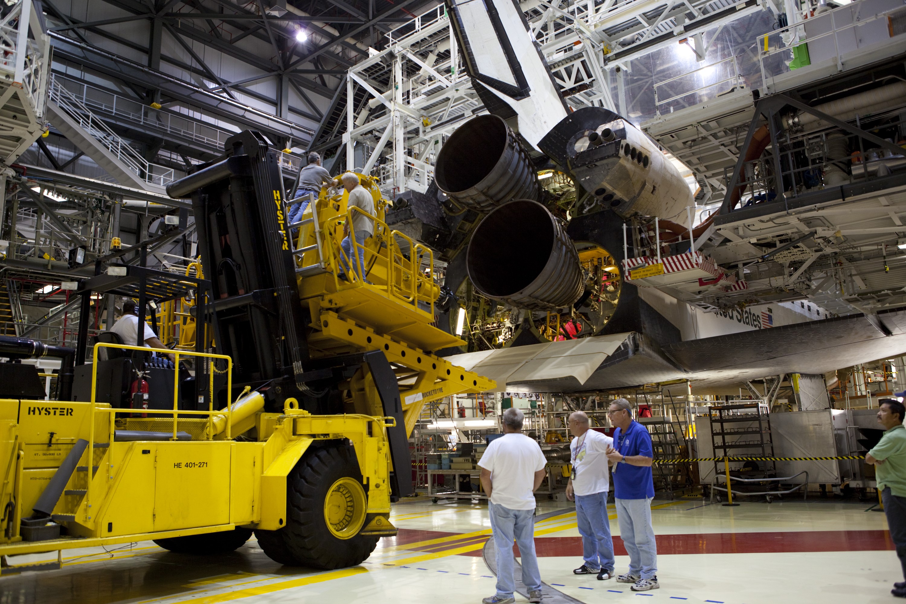 CAPE CANAVERAL, Fla. – Technicians keep a close watch as the Hyster forklift backs away from the space shuttle Endeavour following installation of replica shuttle main engine RSME number 3 inside Orbiter Processing Facility Bay 2 at NASA’s Kennedy Space Center in Florida. The work is part of Transition and Retirement of the remaining space shuttles, Endeavour and Atlantis. Endeavour is being prepared for public display at the California Science Center in Los Angeles. Its ferry flight to California is targeted for mid-September. Endeavour was the last space shuttle added to NASA’s orbiter fleet. Over the course of its 19-year career, Endeavour spent 299 days in space during 25 missions. For more information, visit http://www.nasa.gov/transition Photo credit: NASA/ Dimitri Gerondidakis