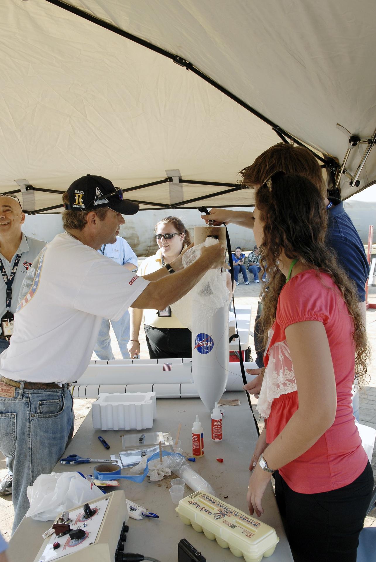 CAPE CANAVERAL, Fla. – Faculty of the International Space University assemble their 1/60th scale model of the Space Launch System rocket during the rocket launch competition of the ISU's summer session. The competition was conducted at Launch Complex 39A at NASA's Kennedy Space Center in Florida, which co-hosted this year's ISU. Six teams designed and built large model rockets, each between three and five feet tall, and launched them from Launch Pad 39A, the starting point for Apollo missions to the moon and dozens of space shuttle flights. Each launch carried a raw egg, dubbed "eggstronauts" and had to recover it intact to be declared successful. Photo credit: NASA/Charisse Nahsser