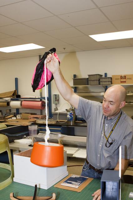 CAPE CANAVERAL, Fla. – Ron Sterick, a participant in the Rocket University program, inspects a capsule and parachute that are being prepared for a high-altitude balloon flight. The test flight was used to evaluate the stability of an instrumented capsule as it fell to Earth before its parachute opened. Rocket University is a program of courses, workshops, labs and projects offered to engineering and research pros of all stripes to keep their skills fresh and broaden their experiences. Photo credit: NASA/Jim Grossmann