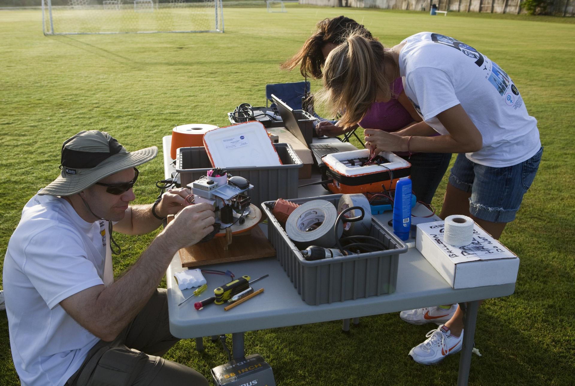 CAPE CANAVERAL, Fla. – Ron Sterick, left to right, Nicole Otermat and Page Attany, participants in the Rocket University program, prepare an instrument package to launch on a high-altitude balloon flight. The test flight was used to evaluate the stability of an instrumented capsule as it fell to Earth before its parachute opened. Rocket University is a program of courses, workshops, labs and projects offered to engineering and research pros of all stripes to keep their skills fresh and broaden their experiences. Photo credit: NASA/Jim Grossmann