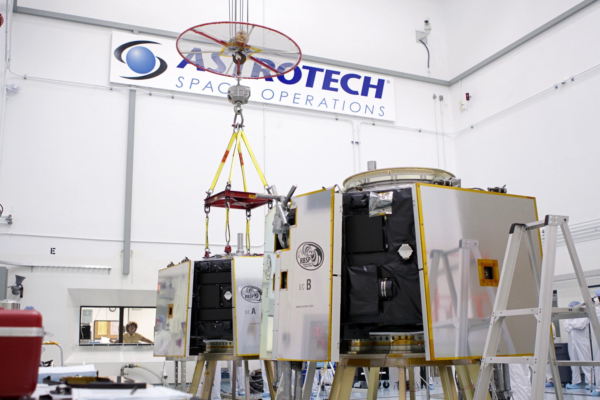 TITUSVILLE, Fla. - Inside the Astrotech payload processing facility in Titusville, Fla. near NASA’s Kennedy Space Center, a crane has been attached to the Radiation Belt Storm Probes, or RBSP, spacecraft A prior to vertical stacking atop RBSP B. NASA’s RBSP mission will help us understand the sun’s influence on Earth and near-Earth space by studying the Earth’s radiation belts on various scales of space and time. RBSP will begin its mission of exploration of Earth’s Van Allen radiation belts and the extremes of space weather after its liftoff aboard a United Launch Alliance Atlas V from Space Launch Complex 41 at Cape Canaveral Air Force Station, Fla. Liftoff is targeted for Aug. 23, 2012. For more information, visit http://www.nasa.gov/rbsp. Photo credit: NASA/Jim Grossmann