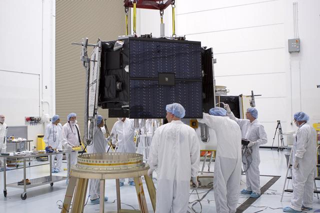 TITUSVILLE, Fla. - Inside the Astrotech payload processing facility in Titusville, Fla. near NASA’s Kennedy Space Center, technicians use a crane to lift the Radiation Belt Storm Probes, or RBSP, spacecraft A for stacking atop RBSP B. NASA’s RBSP mission will help us understand the sun’s influence on Earth and near-Earth space by studying the Earth’s radiation belts on various scales of space and time. RBSP will begin its mission of exploration of Earth’s Van Allen radiation belts and the extremes of space weather after its liftoff aboard a United Launch Alliance Atlas V from Space Launch Complex 41 at Cape Canaveral Air Force Station, Fla. Liftoff is targeted for Aug. 23, 2012. For more information, visit http://www.nasa.gov/rbsp. Photo credit: NASA/Jim Grossmann