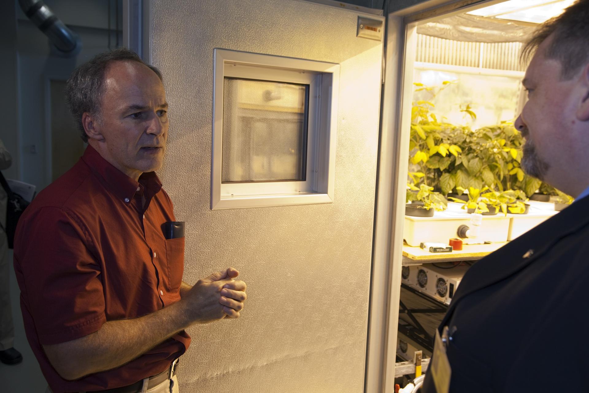 CAPE CANAVERAl, Fla. - Dr. Ray Wheeler, left, explains a plant experiment to Dr. Mason Peck, NASA's chief Technologist, during a tour of the Space Life Sciences Laboratory at Kennedy. Peck toured the lab facility during a visit to the space center. Photo credit: NASA/Frankie Martin