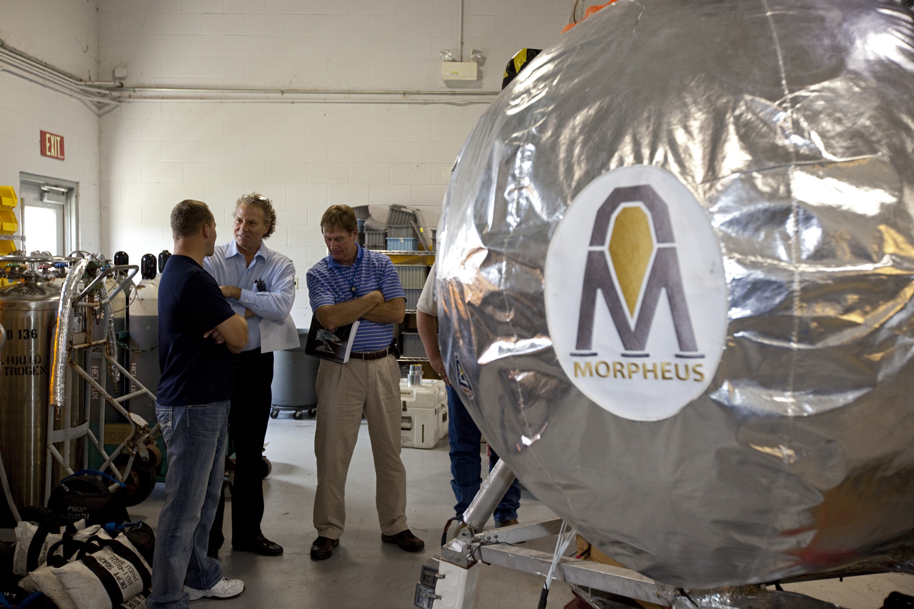 CAPE CANAVERAL, Fla. - Russell Romanella, director of Safety and Mission Assurance at NASA's Kennedy Space Center in Florida, center, is briefed on NASA's Morpheus lander, a vertical test bed vehicle. Morpheus is being checked out by technicians and engineers in a building at the Shuttle Landing Facility, or SLF, at Kennedy. Morpheus is designed to demonstrate new green propellant propulsion systems and autonomous landing and an Autonomous Landing and Hazard Avoidance Technology, or ALHAT, system. Checkout of the prototype lander has been ongoing at NASA’s Johnson Space Center in Houston in preparation for its first free flight. The SLF site will provide the lander with the kind of field necessary for realistic testing. Project Morpheus is one of 20 small projects comprising the Advanced Exploration Systems, or AES, program in NASA’s Human Exploration and Operations Mission Directorate. AES projects pioneer new approaches for rapidly developing prototype systems, demonstrating key capabilities and validating operational concepts for future human missions beyond Earth orbit. For more information on Project Morpheus, visit http://www.nasa.gov/centers/johnson/exploration/morpheus/index.html Photo credit: NASA/Dimitri Gerondidakis