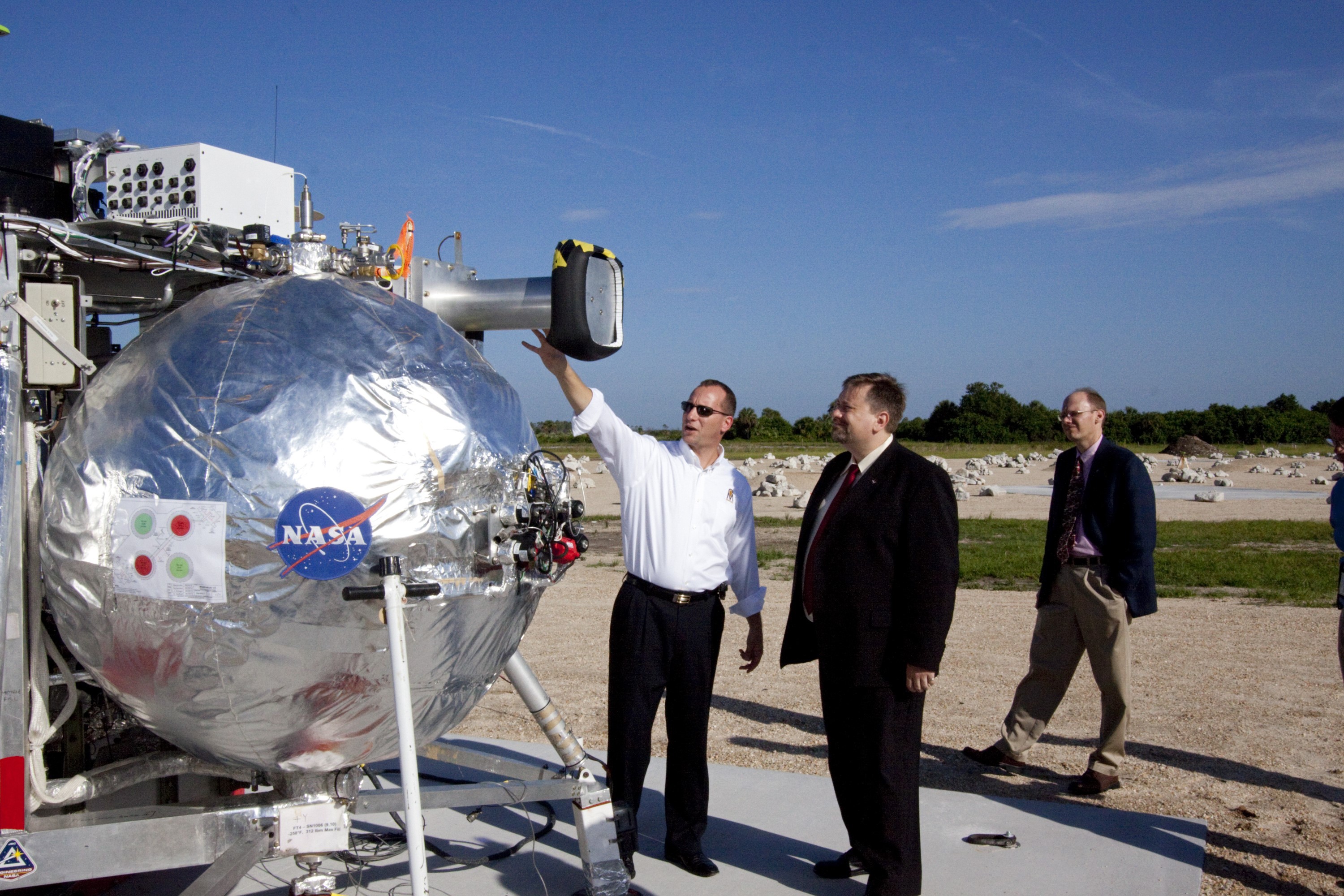 CAPE CANAVERAL, Fla. – Dr. Mason Peck, NASA's chief technologist, talks with managers of the Morpheus lander that will soon begin flight and landing tests at the Shuttle Landing Facility at NASA's Kennedy Space Center in Florida. Photo credit: NASA/Jim Grossmann