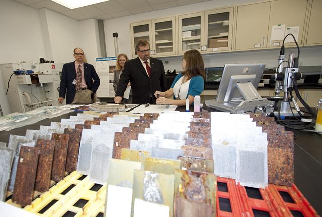 CAPE CANAVERAL, Fla. – Eliza Montgomery, right, talks to Dr. Mason Peck, NASA's chief technologist, inside the Corrosion lab at NASA's Kennedy Space Center in Florida as David Steitz, left, and Karen Thompson, Kennedy's chief technologist, look on. Photo credit: NASA/Jim Grossmann
