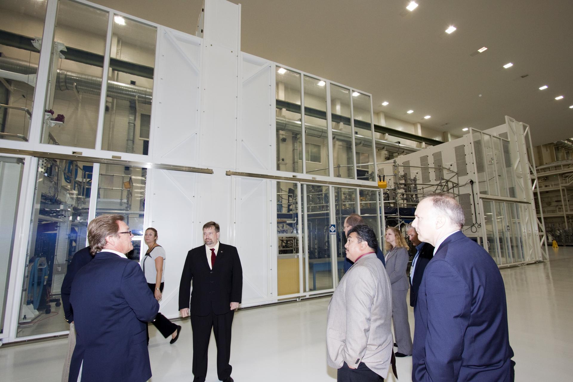 CAPE CANAVERAL, Fla. – Dr. Mason Peck, center, NASA's chief technologist, listens to details about the processing of the agency's first flight test Orion spacecraft by Lockheed Martin inside the Operations and Checkout Building's high bay at Kennedy Space Center in Florida. Photo credit: NASA/Jim Grossmann