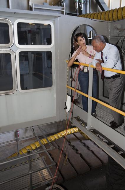 CAPE CANAVERAL, Fla. – NASA Administrator Charlie Bolden sees firsthand how Kennedy Space Center is transitioning to a spaceport of the future as Kennedy's Mary Hanna explains the upcoming use of the crawler-transporter, which has carried space vehicles to the launch pad since the Apollo Program. NASA is working with U.S. industry partners to develop commercial spaceflight capabilities to low Earth orbit as the agency also is developing the Orion Multi-Purpose Crew Vehicle MPCV and the Space Launch System SLS, a crew capsule and heavy-lift rocket to provide an entirely new capability for human exploration. Designed to be flexible for launching spacecraft for crew and cargo missions, SLS and Orion MPCV will expand human presence beyond low Earth orbit and enable new missions of exploration across the solar system. Photo credit: NASA/Kim Shiflett