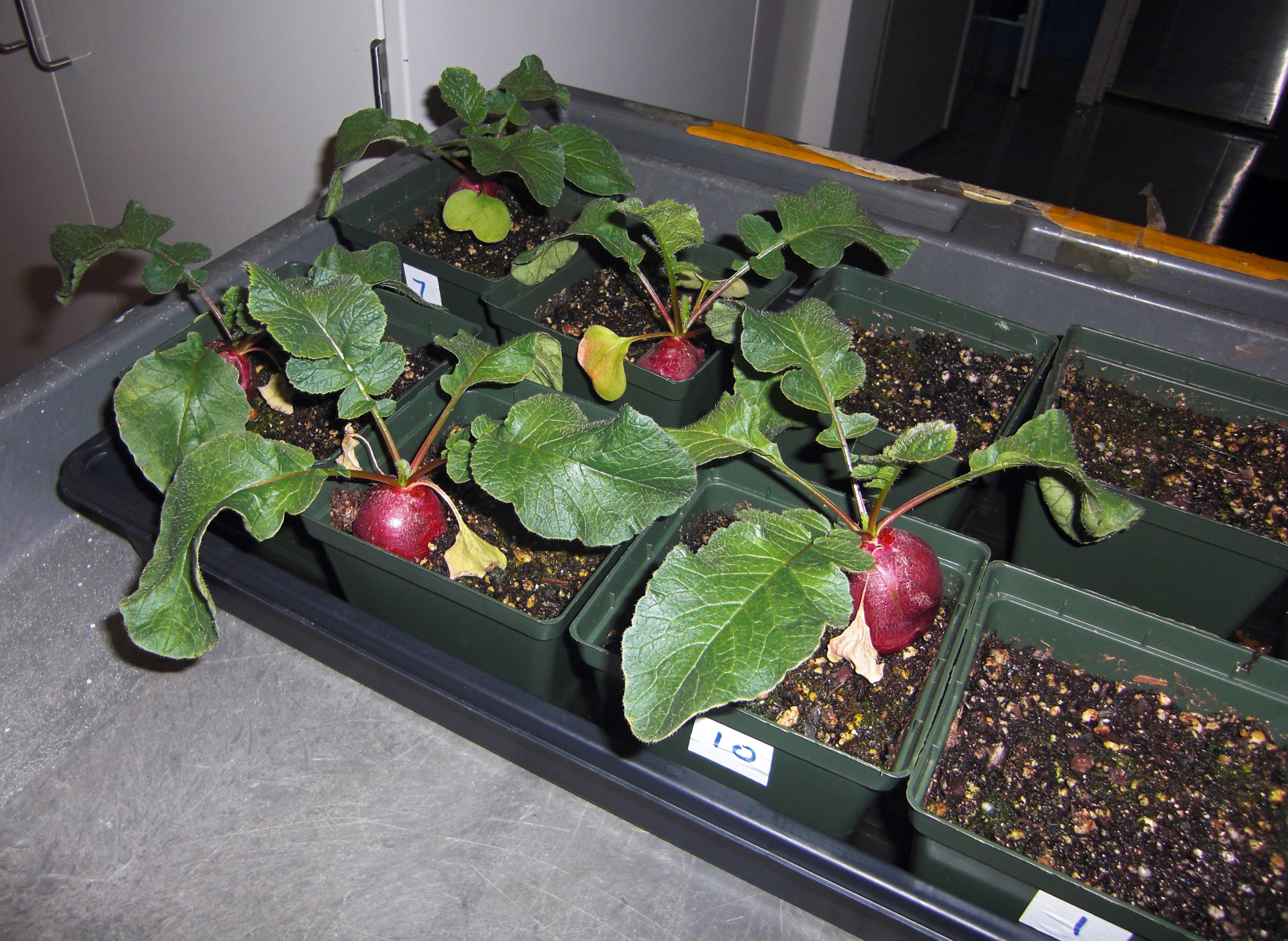 CAPE CANAVERAL, Fla. – Inside the Space Life Sciences Laboratory, or SLSL, at NASA’s Kennedy Space Center in Florida, radish plants are being harvested in a plant growth chamber. The plants were grown under red and blue LED lights. The plant experiment at Kennedy is part of the Advanced Exploration Systems, or AES, program in NASA’s Human Exploration and Operations Mission Directorate. This plant experiment studies the effects of different types of lighting on plants such as radishes and leaf lettuce. Results of these studies will help provide information on how to grow food sources for deep space exploration missions. AES projects pioneer new approaches for rapidly developing prototype systems, demonstrating key capabilities and validating operational concepts for future human missions beyond Earth orbit. Photo credit: NASA/Frank Ochoa-Gonzales