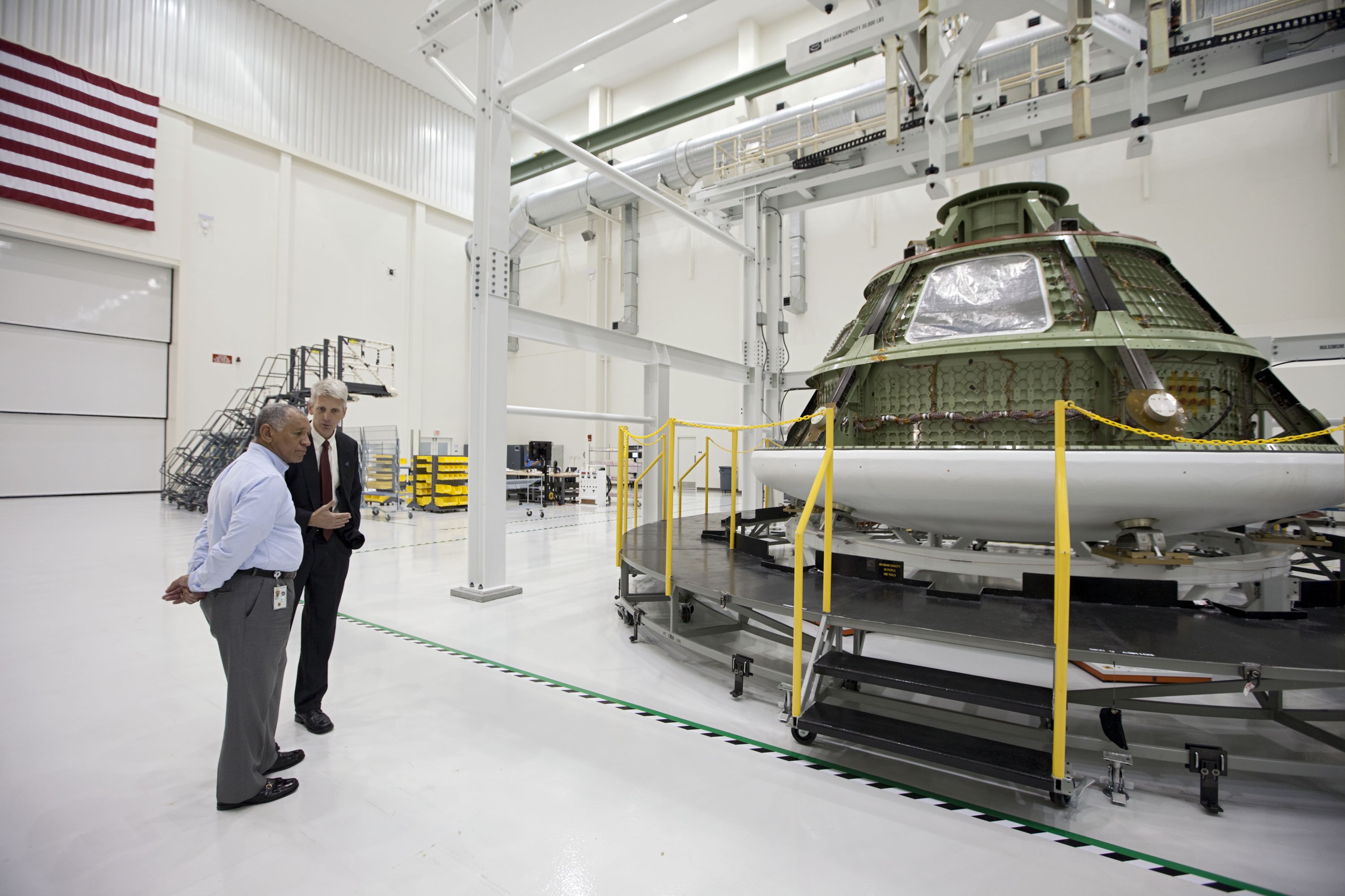 CAPE CANAVERAL, Fla. – NASA's Scott Wilson, right, shows the Orion ground test article to Charles Bolden, NASA administrator, left. The test article is used to perfect processing and equipment steps before they are performed on the flight version of the capsule. The spacecraft is in the high bay at the Operations and Checkout Building at NASA's Kennedy Space Center in Florida. Photo credit: NASA/Kim Shifflett