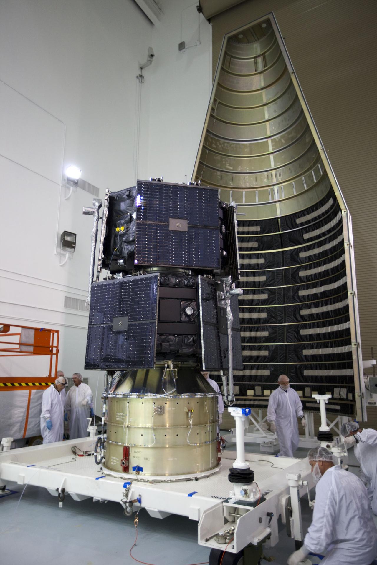 TITUSVILLE, Fla. - Inside the Astrotech payload processing facility in Titusville, Fla. near NASA’s Kennedy Space Center, technicians move the two Radiation Belt Storm Probes, or RBSP, spacecraft into position for encapsulation in the payload faring. The fairing will house and protect the RBSP during liftoff and flight through the atmosphere aboard an Atlas V rocket. NASA’s RBSP mission will help us understand the sun’s influence on Earth and near-Earth space by studying the Earth’s radiation belts on various scales of space and time. RBSP will begin its mission of exploration of Earth’s Van Allen radiation belts and the extremes of space weather after its liftoff aboard a United Launch Alliance Atlas V from Space Launch Complex 41 at Cape Canaveral Air Force Station, Fla. Liftoff is targeted for Aug. 23, 2012. For more information, visit http://www.nasa.gov/rbsp. Photo credit: NASA/ Kim Shiflett