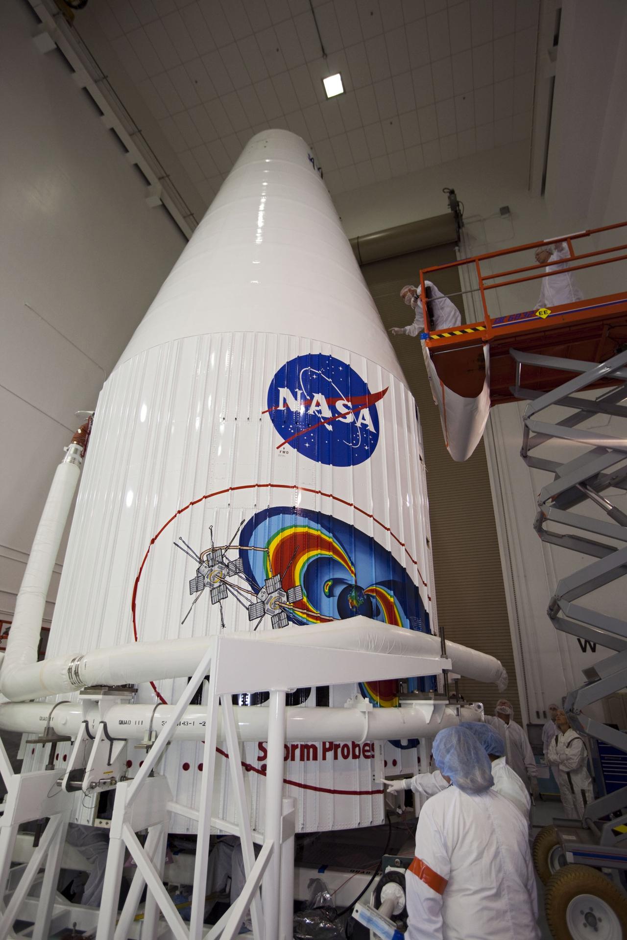 TITUSVILLE, Fla. - Inside the Astrotech payload processing facility in Titusville, Fla. near NASA’s Kennedy Space Center, technicians complete checkouts following encapsulation of the two Radiation Belt Storm Probes, or RBSP, spacecraft with its payload faring. The fairing will house and protect the RBSP during liftoff and flight through the atmosphere aboard an Atlas V rocket. NASA’s RBSP mission will help us understand the sun’s influence on Earth and near-Earth space by studying the Earth’s radiation belts on various scales of space and time. RBSP will begin its mission of exploration of Earth’s Van Allen radiation belts and the extremes of space weather after its liftoff aboard a United Launch Alliance Atlas V from Space Launch Complex 41 at Cape Canaveral Air Force Station, Fla. Liftoff is targeted for Aug. 23, 2012. For more information, visit http://www.nasa.gov/rbsp. Photo credit: NASA/ Kim Shiflett