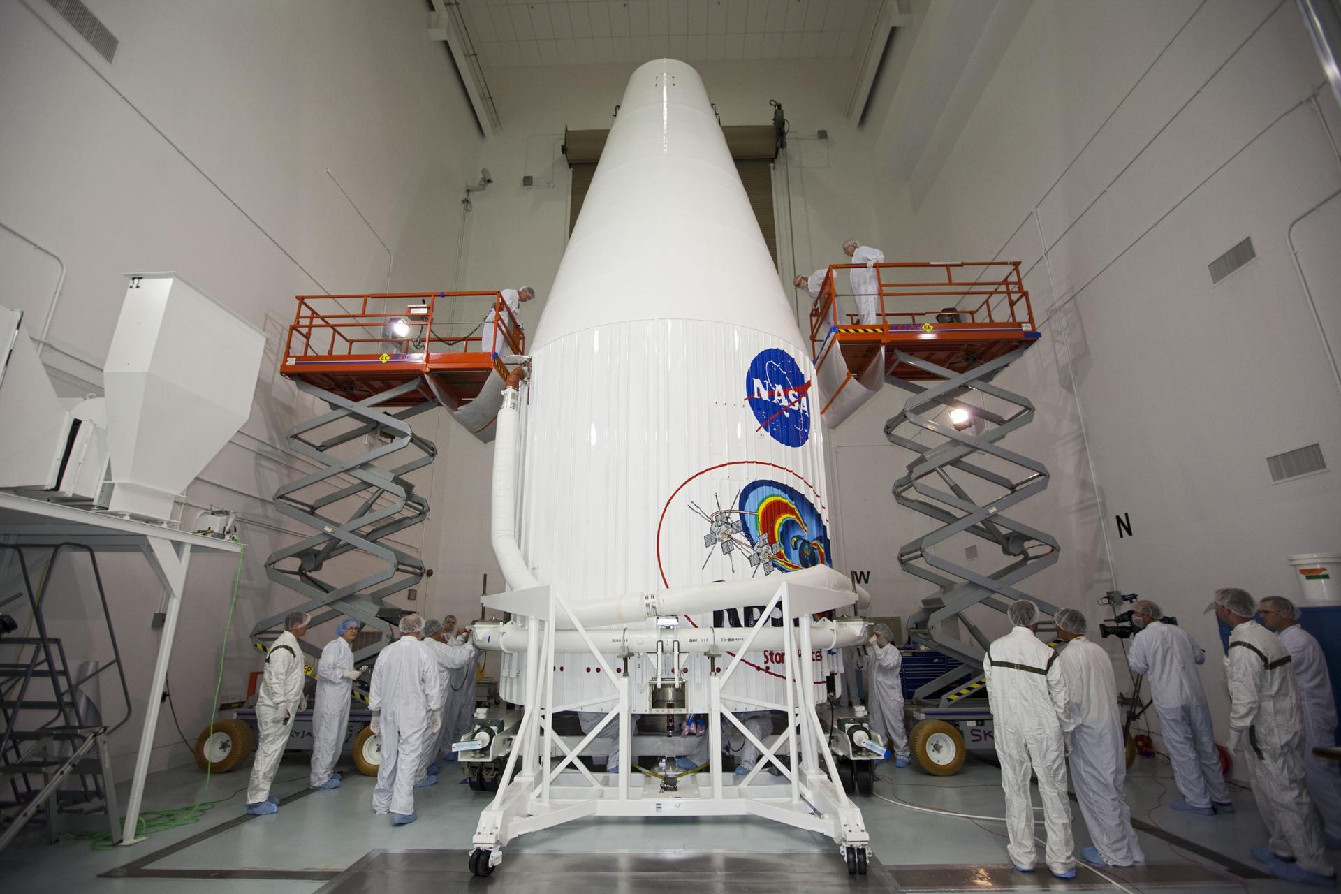 TITUSVILLE, Fla. - Inside the Astrotech payload processing facility in Titusville, Fla. near NASA’s Kennedy Space Center, technicians complete checkouts following encapsulation of the two Radiation Belt Storm Probes, or RBSP, spacecraft with its payload faring. The fairing will house and protect the RBSP during liftoff and flight through the atmosphere aboard an Atlas V rocket. NASA’s RBSP mission will help us understand the sun’s influence on Earth and near-Earth space by studying the Earth’s radiation belts on various scales of space and time. RBSP will begin its mission of exploration of Earth’s Van Allen radiation belts and the extremes of space weather after its liftoff aboard a United Launch Alliance Atlas V from Space Launch Complex 41 at Cape Canaveral Air Force Station, Fla. Liftoff is targeted for Aug. 23, 2012. For more information, visit http://www.nasa.gov/rbsp. Photo credit: NASA/ Kim Shiflett