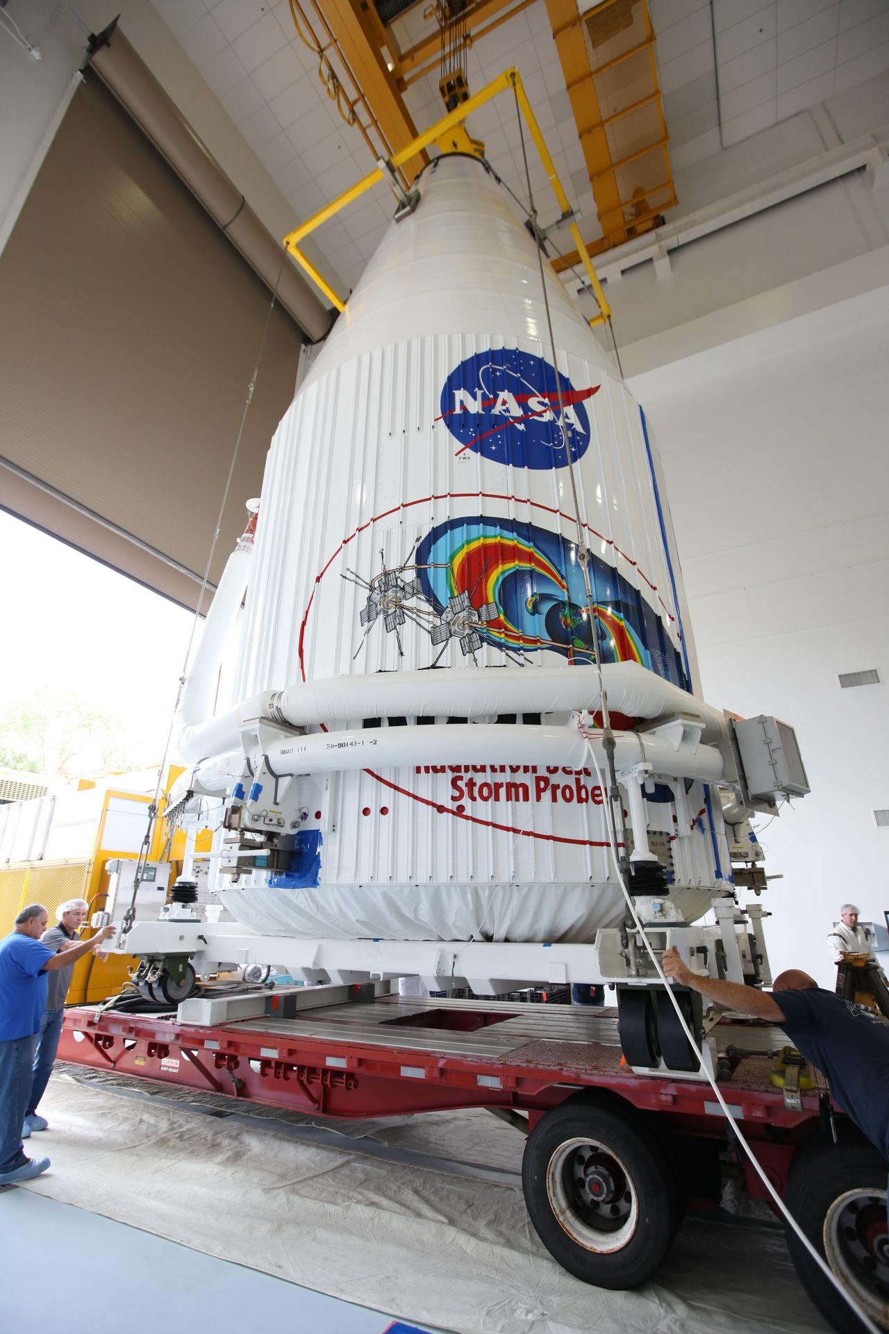 TITUSVILLE, Fla. - Inside the Astrotech payload processing facility in Titusville, Fla. near NASA’s Kennedy Space Center, technicians use a crane to lower the payload faring containing the two Radiation Belt Storm Probes, or RBSP, spacecraft on to a transporter to be moved to the launch complex. NASA’s RBSP mission will help us understand the sun’s influence on Earth and near-Earth space by studying the Earth’s radiation belts on various scales of space and time. RBSP will begin its mission of exploration of Earth’s Van Allen radiation belts and the extremes of space weather after its liftoff aboard a United Launch Alliance Atlas V rocket from Space Launch Complex 41 at Cape Canaveral Air Force Station, Fla. Liftoff is targeted for Aug. 23, 2012. For more information, visit http://www.nasa.gov/rbsp Photo credit: NASA/ Kim Shiflett