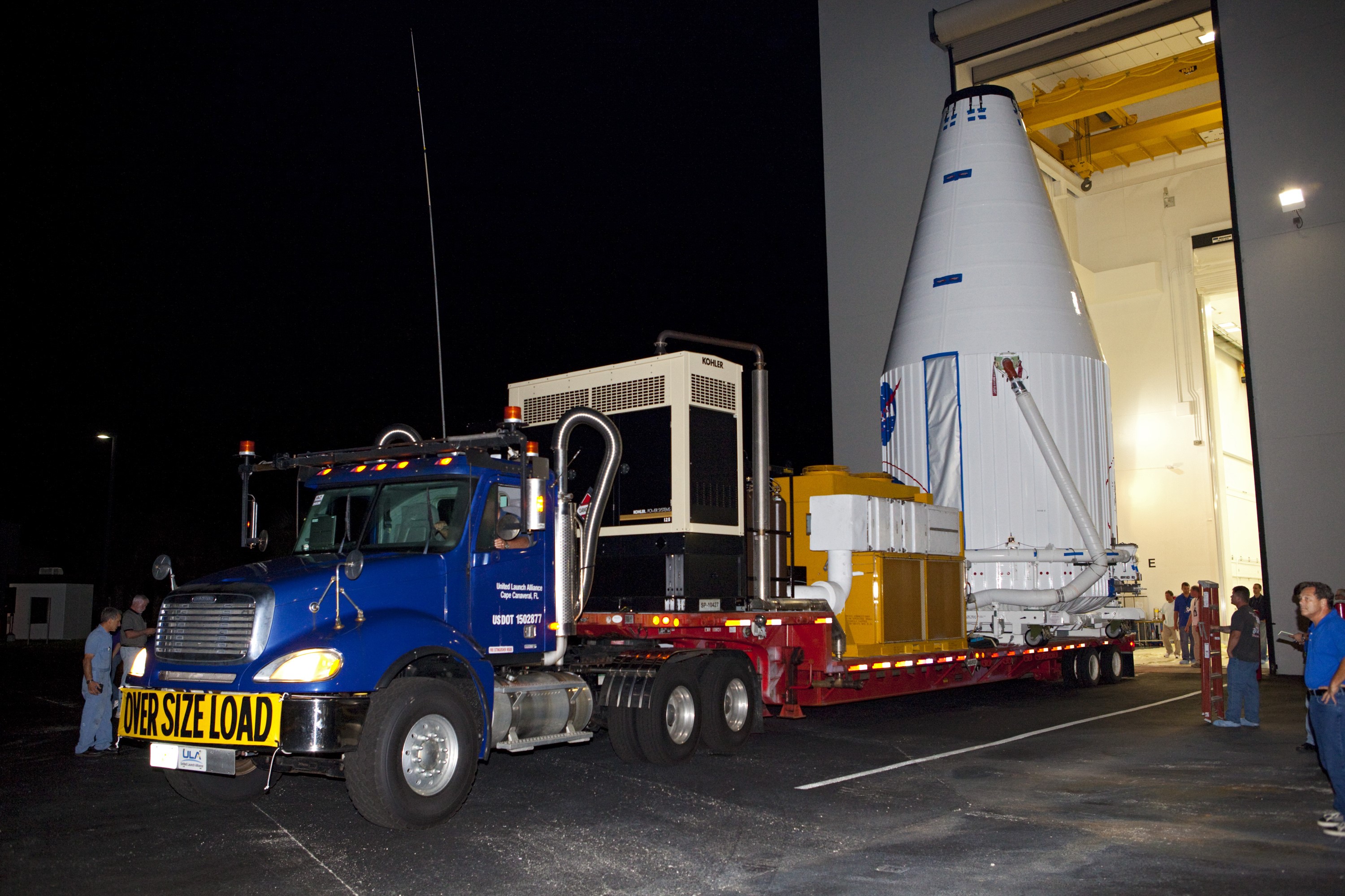 CAPE CANAVERAL, Fla. – The Radiation Belt Storm Probes, or RBSP, spacecraft are moved inside their payload fairing on the payload transporter from the Astrotech payload processing facility in Titusville, Fla. to Space Launch Complex-41 at Cape Canaveral Air Force Station. The fairing, which holds the twin RBSP spacecraft, will be lifted to the top of a United Launch Alliance Atlas V rocket for launch later in August. The two spacecraft are designed to study the Van Allen radiation belts in unprecedented detail. Photo credit: NASA/Dmitri Gerondidakis