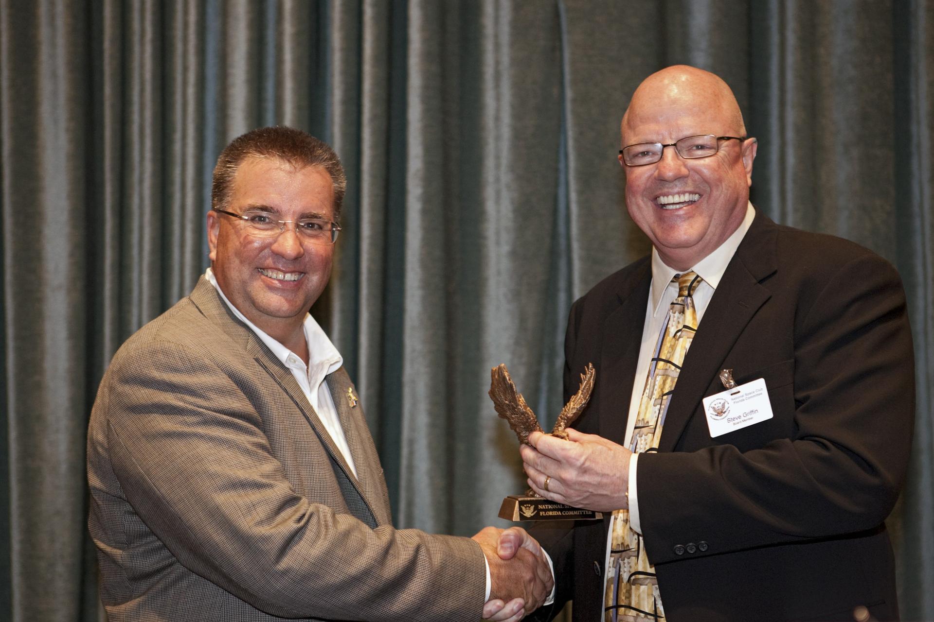 CAPE CANAVERAL, Fla. -- National Space Club Florida Committee Chair Steve Griffin presents NASA Commercial Crew Program Manager Ed Mango with an eagle statue during the club's August luncheon at the Radisson Resort at the Port in Cape Canaveral, Fla. Mango was the event's guest speaker, discussing the innovative steps the agency is taking with industry partners to develop the next U.S. space transportation capability to and from low Earth orbit, which will eventually be available for use by the U.S. government and other commercial customers. To learn more about the Commercial Crew Program, visit www.nasa.gov/commercialcrew. Photo credit: Kim Shiflett