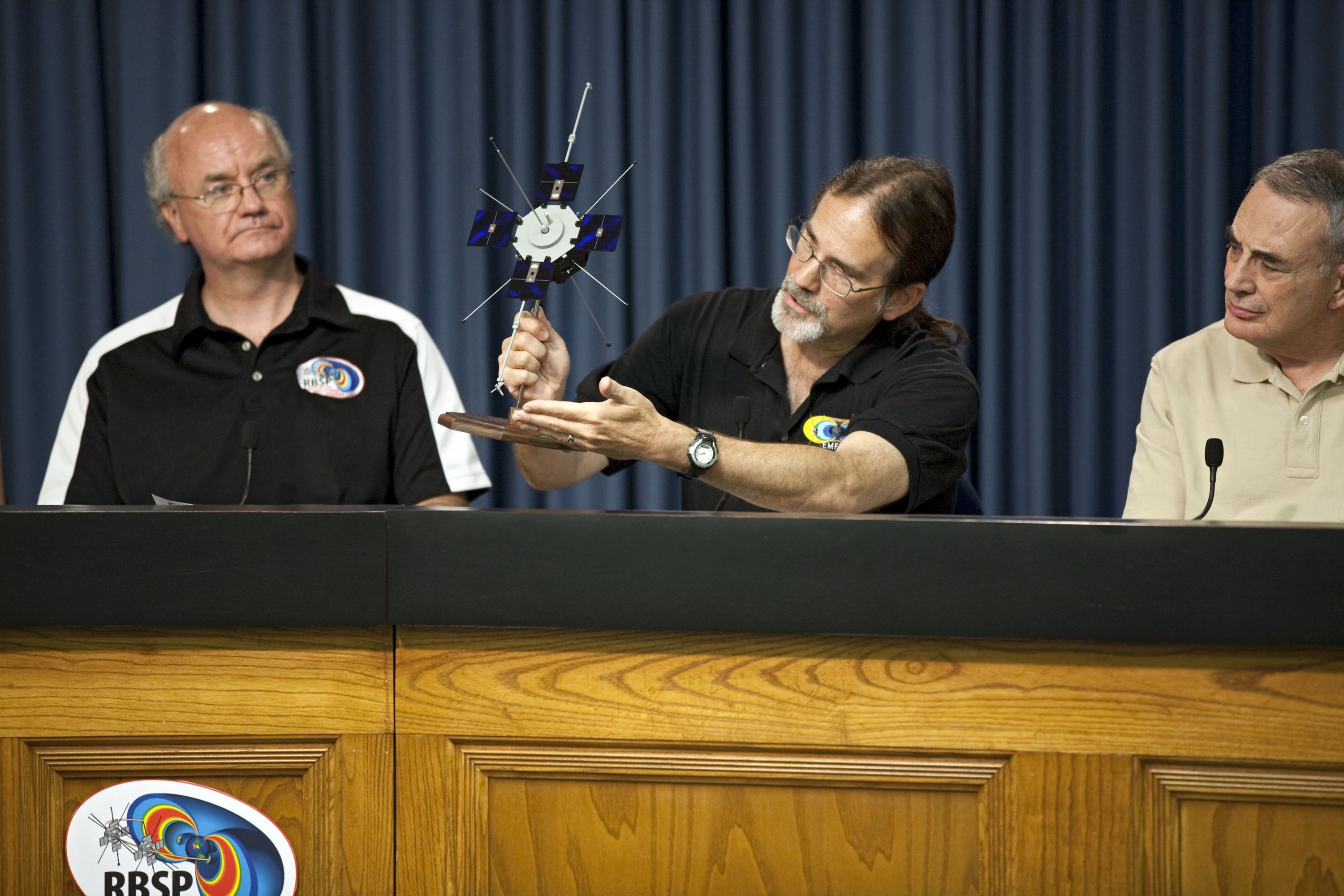 CAPE CANAVERAL, Fla. - During a mission science briefing for the Radiation Belt Storm Probes, or RBSP, mission at NASA Kennedy Space Center’s Press Site in Florida, Craig Kletzing, a principal investigator from the University of Iowa, answers questions and displays a scale model of the twin probes. To the left, is Harlan Spence, principal investigator with the University of New Hampshire. To the right, is Lou Lanzerotti, principal investigator with the New Jersey Institute of Technology. NASA’s RBSP mission will help us understand the sun’s influence on Earth and near-Earth space by studying the Earth’s radiation belts on various scales of space and time. RBSP will begin its mission of exploration of Earth’s Van Allen radiation belts and the extremes of space weather after its launch aboard an Atlas V rocket. Launch is targeted for Aug. 24. For more information, visit http://www.nasa.gov/rbsp. Photo credit: NASA/Glenn Benson