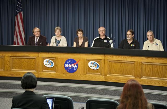 CAPE CANAVERAL, Fla. - A mission science briefing was held at NASA Kennedy Space Center’s Press Site in Florida for the Radiation Belt Storm Probes, or RBSP, mission. From left, are George Diller, public affairs specialist and news conference moderator, Mona Kessel, RBSP program scientist from NASA Headquarters in Washington, Nicola Fox, RBSP deputy project scientist at Johns Hopkins Applied Physics Laboratory in Laurel, Md., Craig Kletzing, principal investigator from the University of Iowa, Harlan Spence, principal investigator from the University of New Hampshire, and Lou Lanzerotti, principal investigator from the New Jersey Institute of Technology. NASA’s RBSP mission will help us understand the sun’s influence on Earth and near-Earth space by studying the Earth’s radiation belts on various scales of space and time. RBSP will begin its mission of exploration of Earth’s Van Allen radiation belts and the extremes of space weather after its launch aboard an Atlas V rocket. Launch is targeted for Aug. 24. For more information, visit http://www.nasa.gov/rbsp. Photo credit: NASA/Glenn Benson