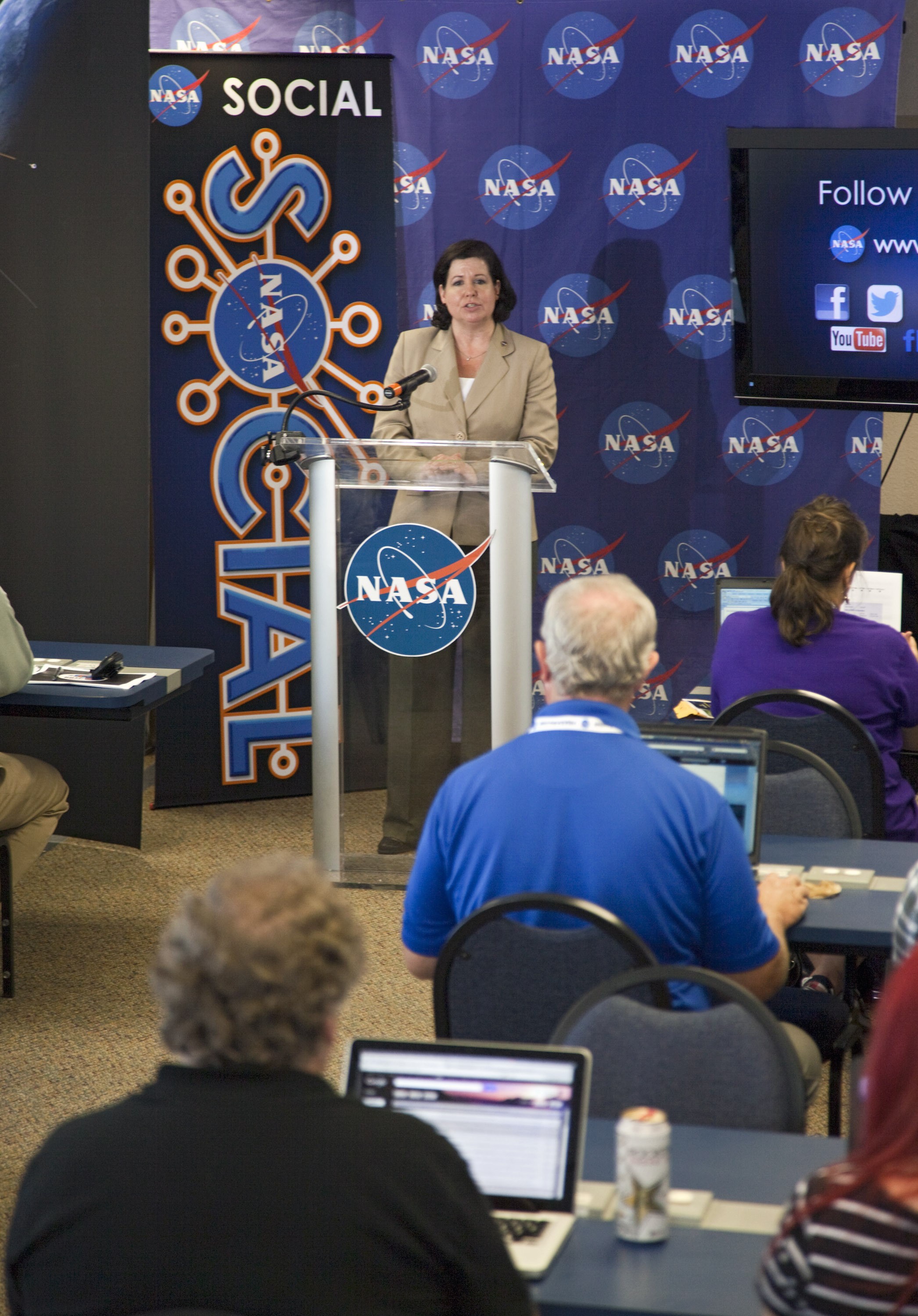 CAPE CANAVERAL, Fla. – At NASA's Kennedy Space Center in Florida, Barbara Giles, director of NASA's Science Mission Directorate Heliophysics Division, talks to agency social media followers during the second day of NASA Social activities revolving around NASA's Radiation Belt Storm Probes, or RBSP, mission. The probes are set to launch aboard a United Launch Alliance, or ULA, Atlas V rocket from nearby Cape Canaveral Air Force Station. About 40 followers were selected to participate in RBSP's prelaunch and launch activities. The RBSP mission will help us understand the sun’s influence on Earth and near-Earth space by studying the Earth’s radiation belts on various scales of space and time. RBSP will begin its mission of exploration of Earth’s Van Allen radiation belts and the extremes of space weather. For more information, visit http://www.nasa.gov/rbsp. Photo credit: NASA/Frankie Martin
