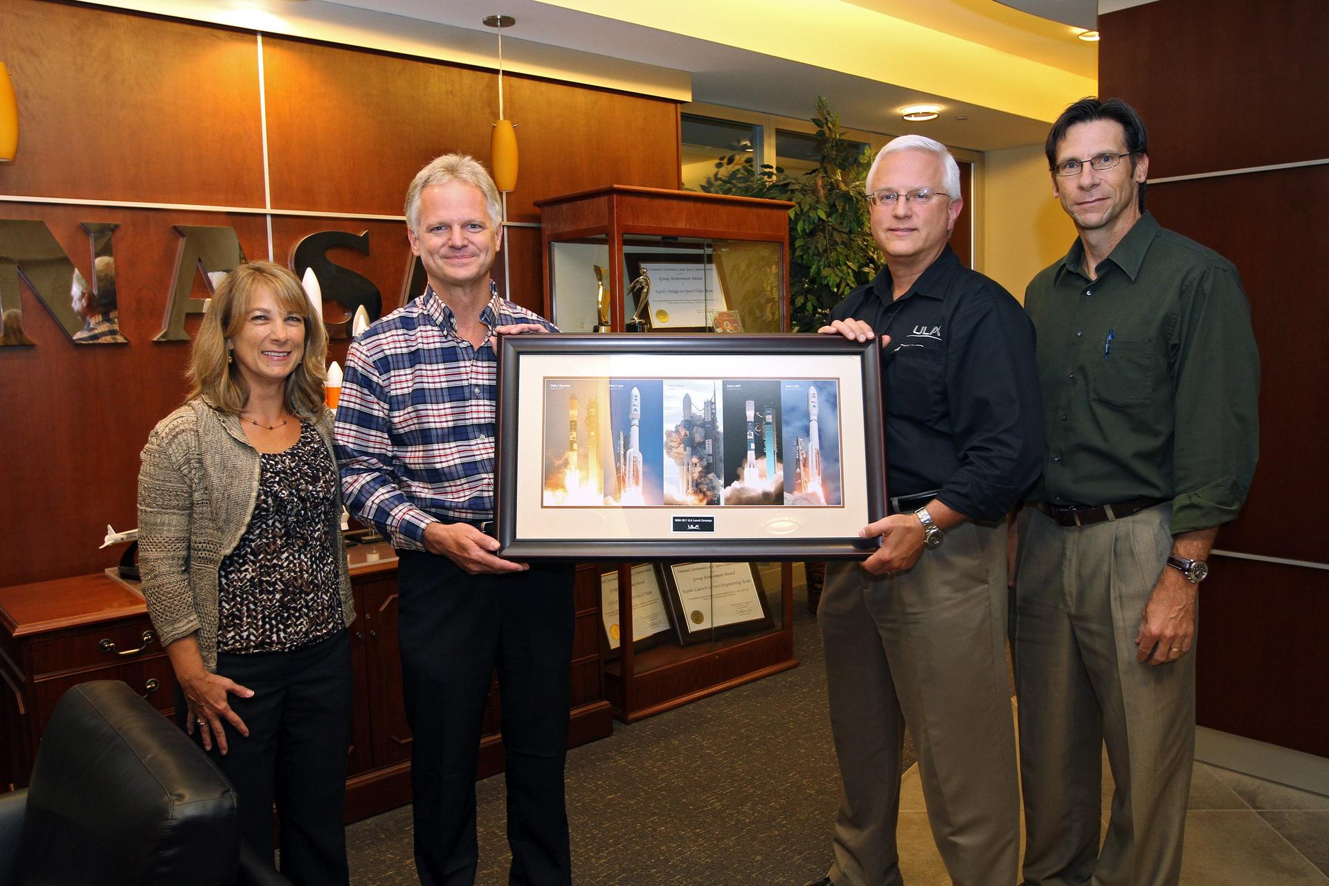 CAPE CANAVERAL, Fla. – At NASA’s Kennedy Space Center in Florida, the Launch Services Program, or LSP, Program Manager Amanda Mitskevich, at far left, was presented with a framed commemorative collage of five United Launch Alliance, or ULA, mission photos in 2011 from Jim Sponnick, second from left, vice president of Mission Operations at ULA. Also at the presentation, were ULA Program Manager for NASA Missions Vern Thorp and LSP Deputy Program Manager Chuck Dovale. Photo credit: NASA/Kim Shiflett