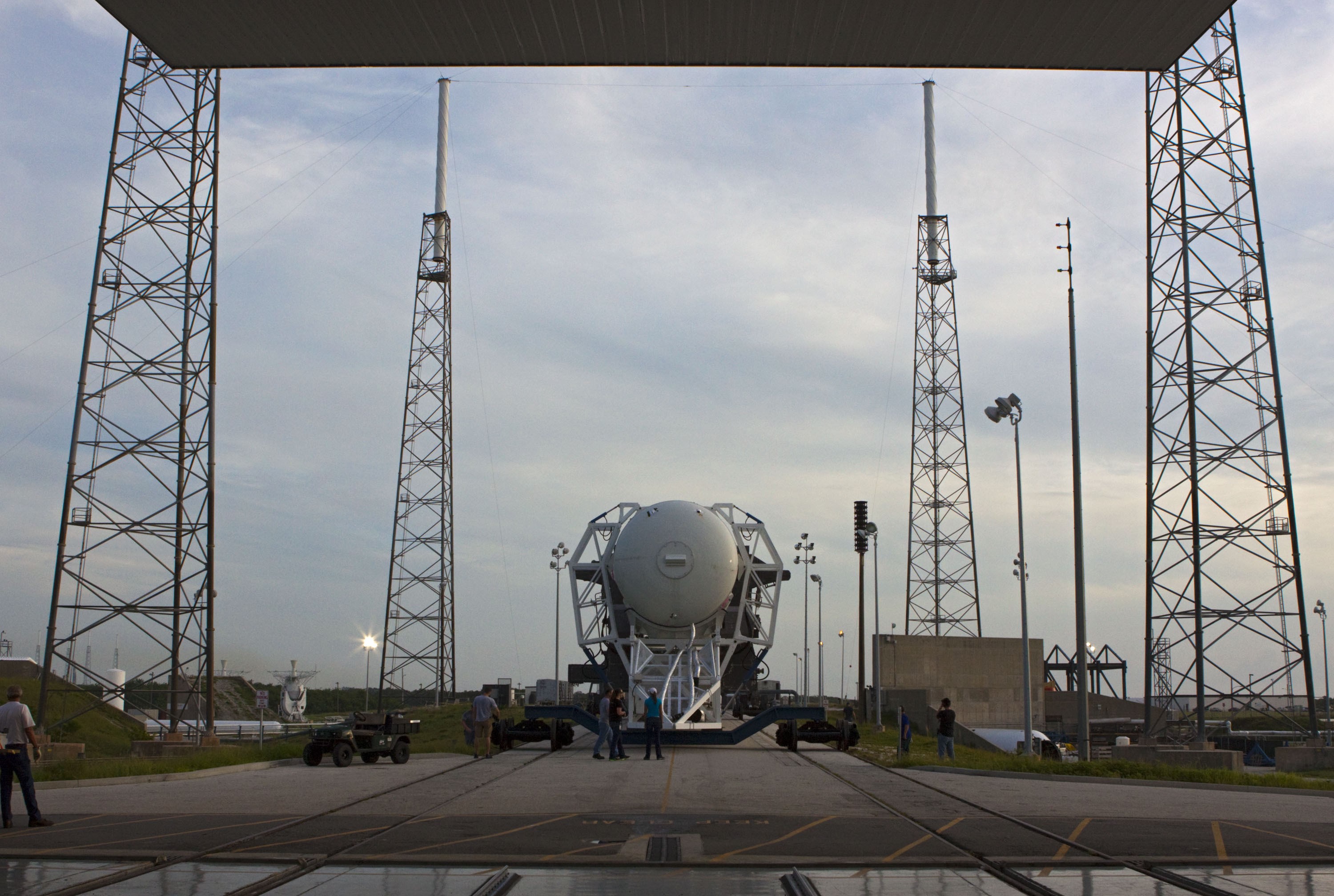 CAPE CANAVERAL, Fla. -- The Space Exploration Technologies, or SpaceX, Falcon 9 rocket rolls out of its processing hangar toward Space Launch Complex 40 at Cape Canaveral Air Force Station in Florida for a wet dress rehearsal. During the rehearsal, the rocket will be fully fueled and launch controllers will perform a countdown demonstration. The rehearsal is in preparation for the company's first Commercial Resupply Services, or CRS, mission to the International Space Station aboard the Dragon capsule. The SpaceX CRS contract with NASA provides for 12 cargo resupply missions to the station through 2015, the first of which is targeted to launch in October 2012.SpaceX became the first private company to berth a spacecraft with the space station in 2012 during its final demonstration flight under the Commercial Orbital Transportation Services, or COTS, program managed by NASA's Johnson Space Center in Houston. Photo credit: NASA/Jim Grossmann