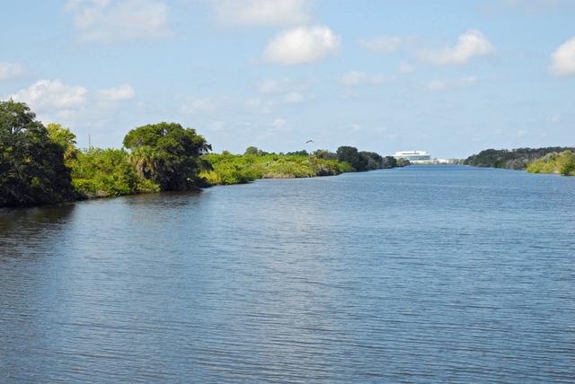 CAPE CANAVERAL, Fla. – Operations Support Building II, or OSBII, is seen in the distance during a field-guided boat tour of NASA's Kennedy Space Center in Florida. As part of the center's first-ever Innovation Expo, the tour, called "Living Outdoor Laboratory for Environmental Sustainability," is giving employees the opportunity to see the unique estuarine ecosystems that are protected from development by the presence of Kennedy and the Merritt Island National Wildlife Refuge. The diverse and healthy area encompassing about 140,000 acres of central Florida's east coast has been closed to the public for 50 years, allowing the coastal dunes, saltwater estuaries and marshes, freshwater impoundments, scrub, pine flatwoods, and hardwood hammocks to provide habitats for more than 1,000 species of plants and animals. Innovation Expo is showcasing the innovative work taking place throughout the center's facilities and labs to encourage employees to work together to solve future challenges. For more information, visit http://www.nasa.gov/kennedy. Photo credit: NASA