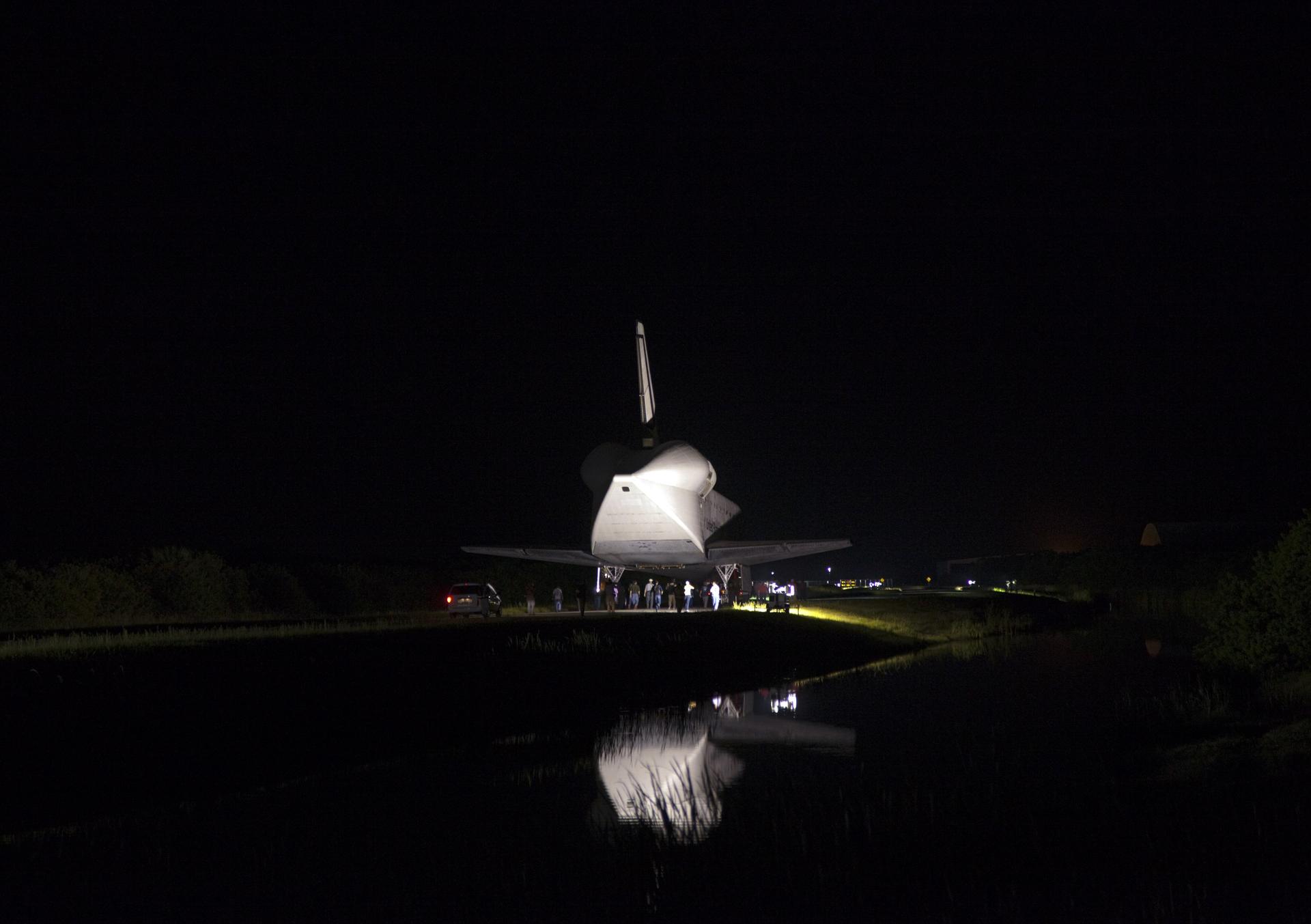 CAPE CANAVERAL, Fla. – Workers escort space shuttle Endeavour as it is towed to the Mate-Demate Device, or MDD, at NASA's Kennedy Space Center in Florida after being backed out of the Vehicle Assembly Building. The MDD is located at the Shuttle Landing Facility at Kennedy. The shuttle will be lifted and connected to the top of NASA's Shuttle Carrier Aircraft SCA, a modified 747 jetliner. The shuttle has been fitted with an aerodynamic tailcone for its flight aboard the SCA to Los Angeles where it will be placed on public display. Photo credit: NASA/ Frankie Martin