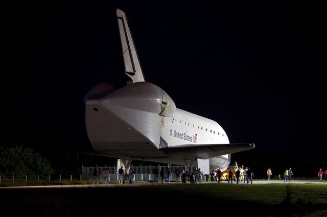 CAPE CANAVERAL, Fla. - Workers escort space shuttle Endeavour as it is towed to the Mate-Demate Device, or MDD, at NASA's Kennedy Space Center in Florida after being backed out of the Vehicle Assembly Building. The MDD is located at the Shuttle Landing Facility at Kennedy. The shuttle will be lifted and connected to the top of NASA's Shuttle Carrier Aircraft SCA, a modified 747 jetliner. The shuttle has been fitted with an aerodynamic tailcone for its flight aboard the SCA to Los Angeles where it will be placed on public display. Photo credit: NASA/Dmitri Gerondidakis
