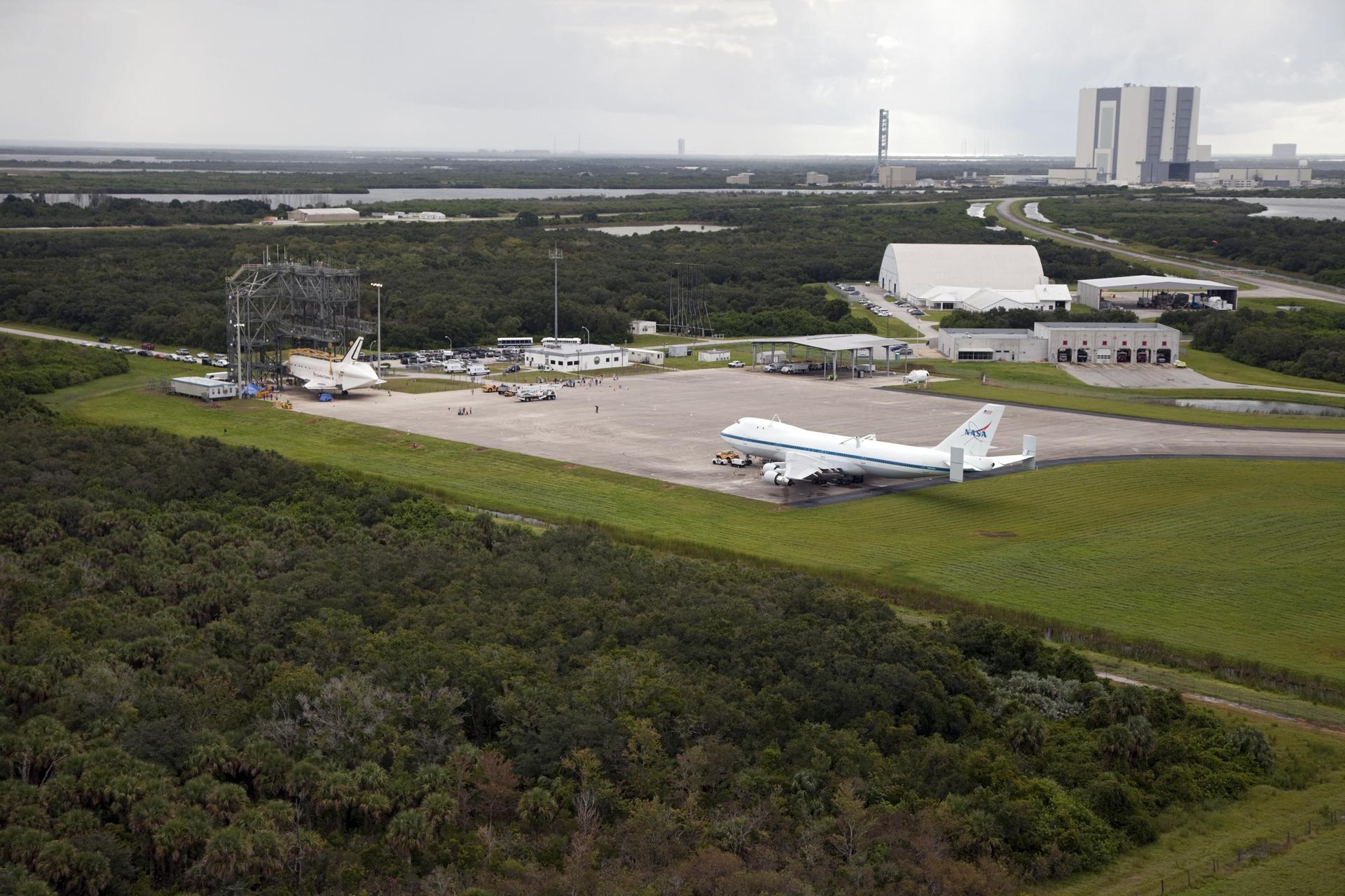 CAPE CANAVERAL, Fla. – Space shuttle Endeavour is seen inside the Mate-Demate Device, or MDD, at the Shuttle Landing Facility at NASA's Kennedy Space Center in Florida. The Shuttle Carrier Aircraft, or SCA, is seen on the ramp. The SCA will carry Endeavour to Los Angeles where it will be placed on public display. The center's Vehicle Assembly Building, or VAB, and the mobile launcher built for the Space Launch System are also visible in the background. Photo credit: NASA/Kim Shiflett