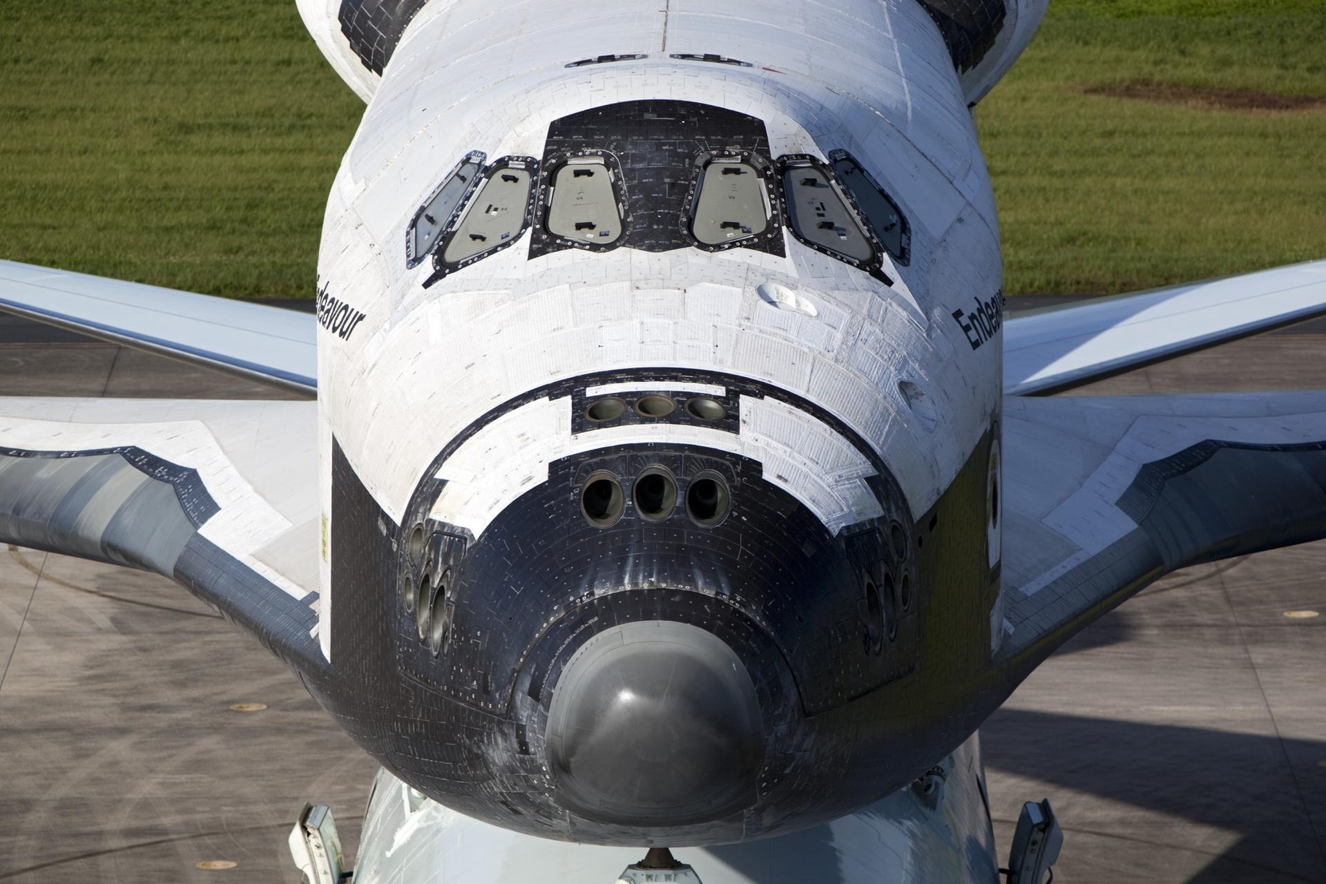 CAPE CANAVERAL, Fla. – Preparations are under way to uncover the cockpit windows on space shuttle Endeavour for an employee photo opportunity at the Shuttle Landing Facility at NASA's Kennedy Space Center in Florida. Endeavour is balanced and secured atop NASA's Shuttle Carrier Aircraft, or SCA. The SCA, a modified 747 jetliner, will fly Endeavour to Los Angeles where it will be placed on public display at the California Science Center. This is the final ferry flight scheduled in the Space Shuttle Program era. For more information on the shuttles' transition and retirement, visit http://www.nasa.gov/transition. Photo credit: NASA/Dimitri Gerondidakis