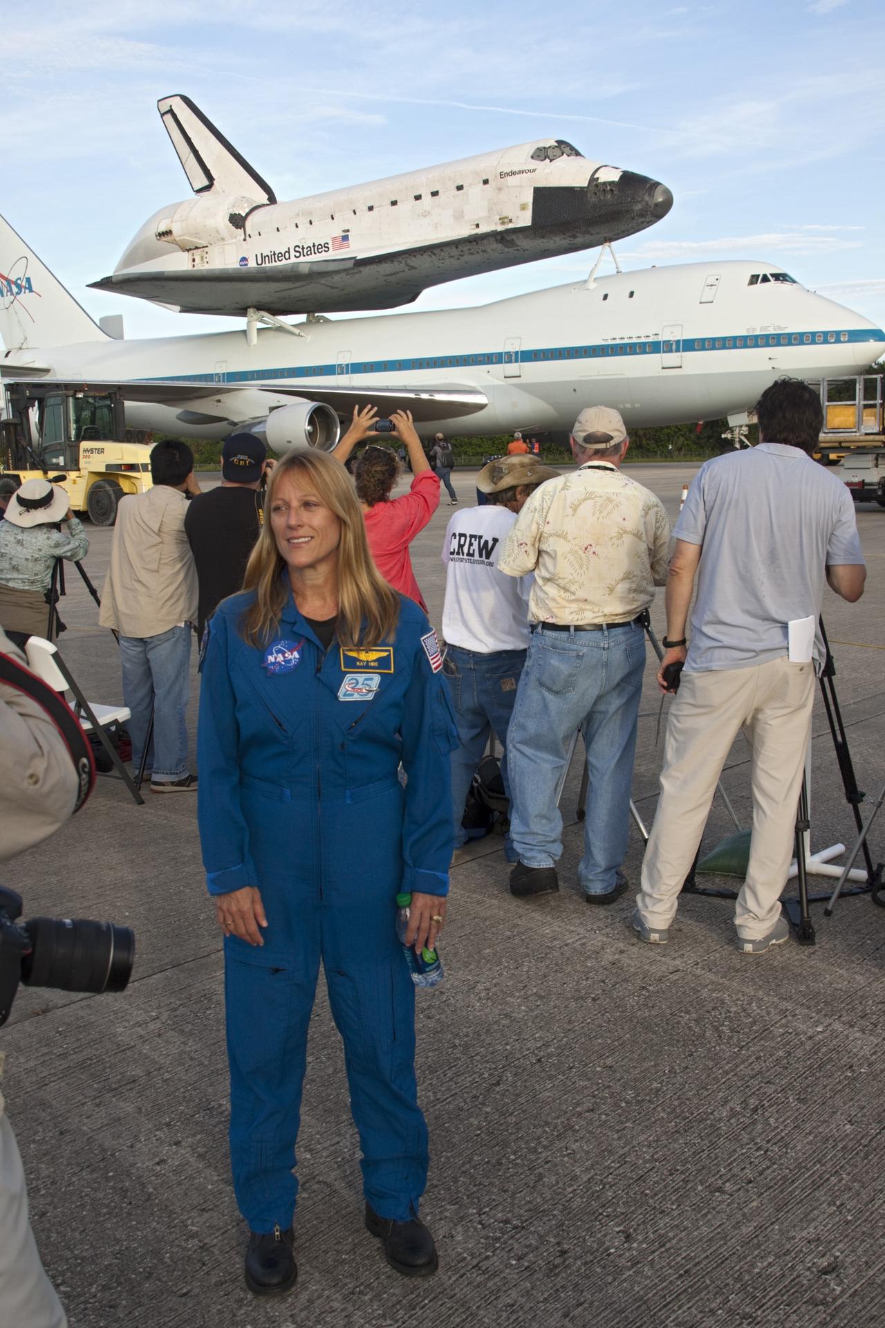CAPE CANAVERAL, Fla. – At the Shuttle Landing Facility at NASA's Kennedy Space Center in Florida, NASA astronaut Kay Hire is on hand discuss the space shuttle Endeavour's trip to California mounted atop NASA's Shuttle Carrier Aircraft, or SCA. The SCA, a modified 747 jetliner, will fly Endeavour to Los Angeles where it will be placed on public display at the California Science Center. This is the final ferry flight scheduled in the Space Shuttle Program era. For more information on the shuttles' transition and retirement, visit http://www.nasa.gov/transition. Photo credit: NASA/ Tim Jacobs