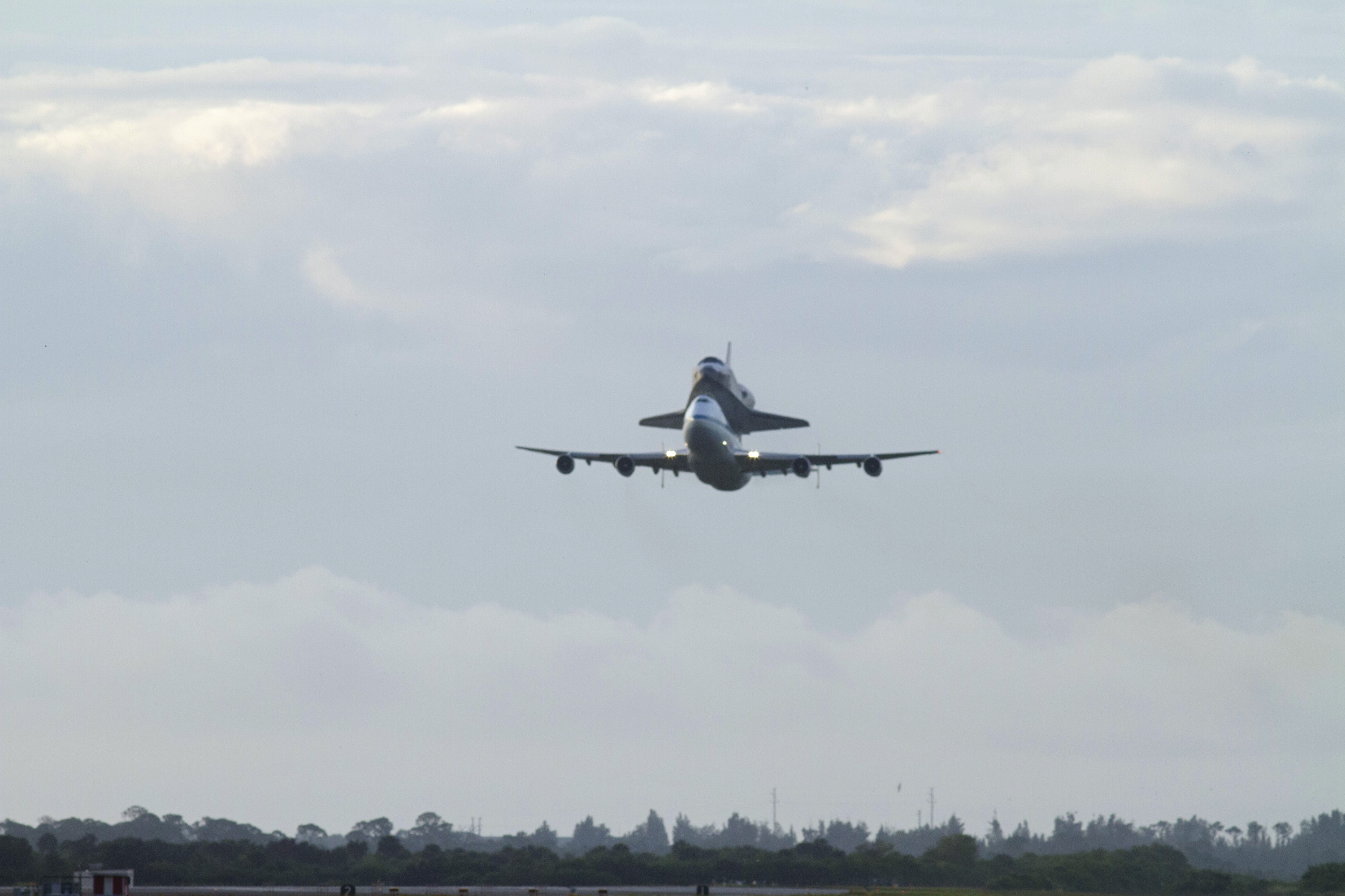 CAPE CANAVERAL, Fla. – Space shuttle Endeavour, mounted atop NASA's Shuttle Carrier Aircraft or SCA, flies over the Shuttle Landing Facility at NASA's Kennedy Space Center in Florida. The SCA, a modified 747 jetliner, will fly Endeavour to Los Angeles where it will be placed on public display at the California Science Center. This is the final ferry flight scheduled in the Space Shuttle Program era. For more information on the shuttles' transition and retirement, visit http://www.nasa.gov/transition. Photo credit: NASA/Rick Wetherington