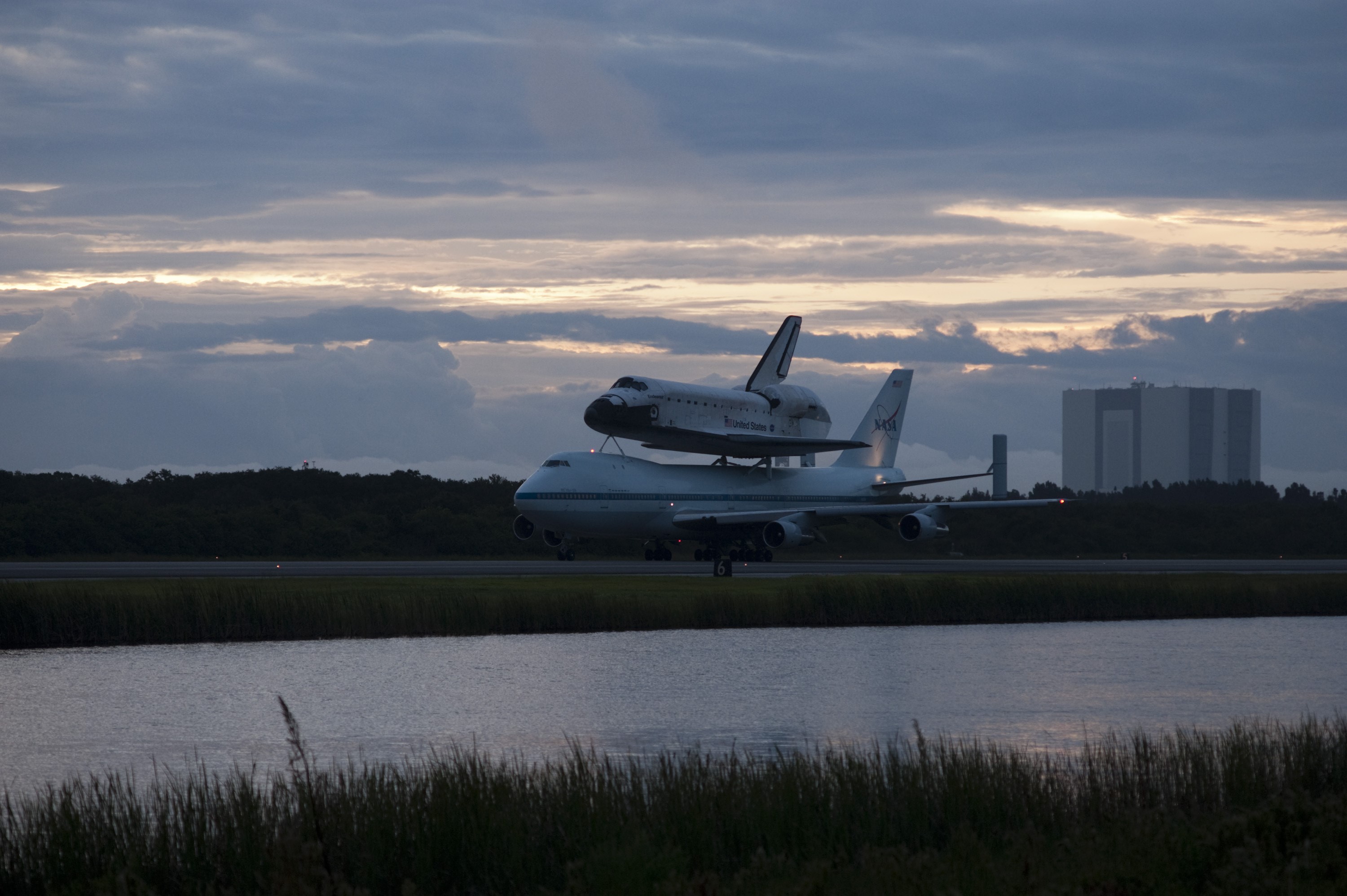 CAPE CANAVERAL, Fla. – Space shuttle Endeavour, mounted atop NASA's Shuttle Carrier Aircraft or SCA, taxis at the Shuttle Landing Facility at NASA's Kennedy Space Center in Florida. The SCA, a modified 747 jetliner, will fly Endeavour to Los Angeles where it will be placed on public display at the California Science Center. This is the final ferry flight scheduled in the Space Shuttle Program era. For more information on the shuttles' transition and retirement, visit http://www.nasa.gov/transition. Photo credit: NASA/Rick Wetherington