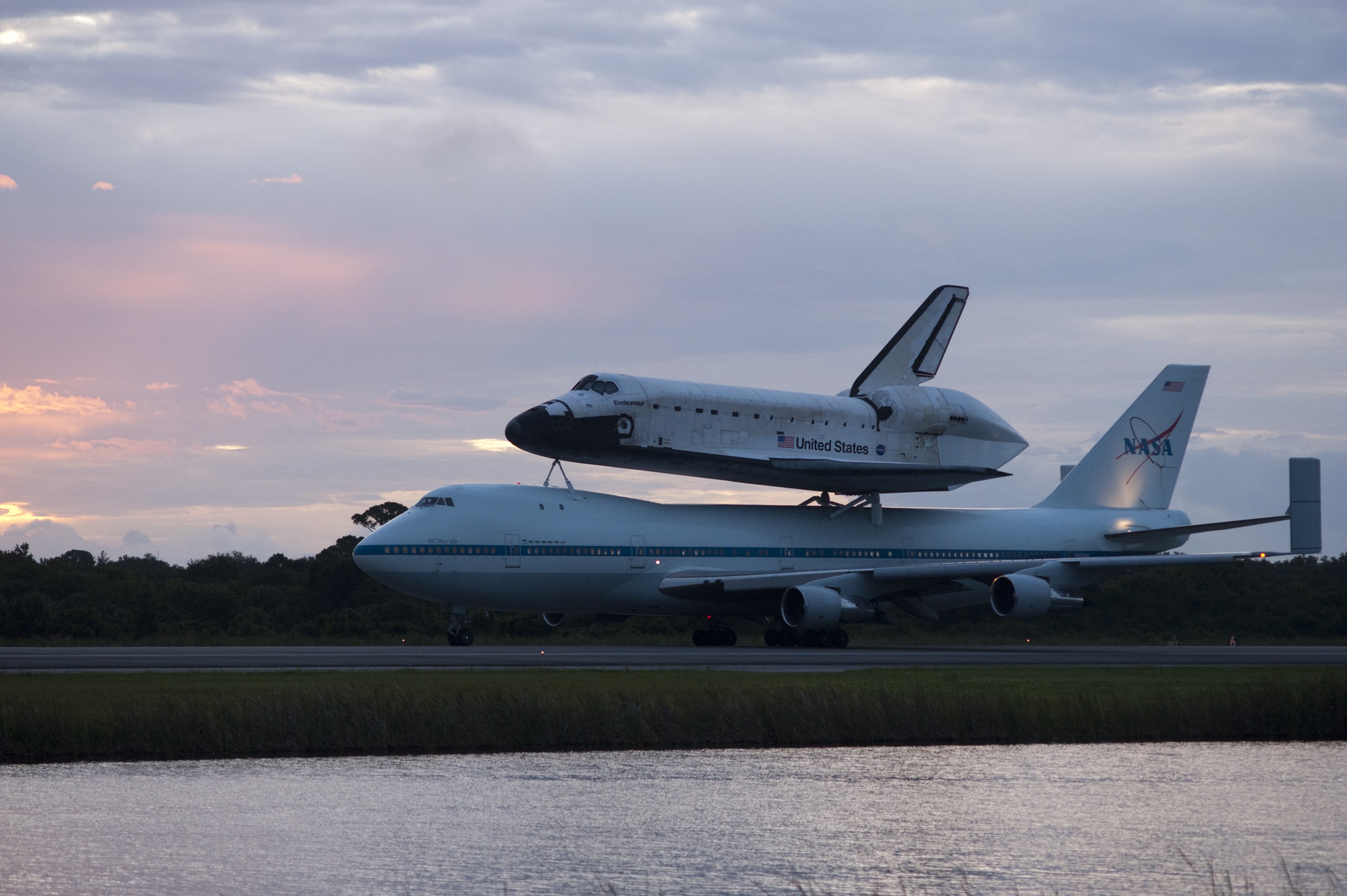CAPE CANAVERAL, Fla. – Space shuttle Endeavour, mounted atop NASA's Shuttle Carrier Aircraft or SCA, taxis at the Shuttle Landing Facility at NASA's Kennedy Space Center in Florida. The SCA, a modified 747 jetliner, will fly Endeavour to Los Angeles where it will be placed on public display at the California Science Center. This is the final ferry flight scheduled in the Space Shuttle Program era. For more information on the shuttles' transition and retirement, visit http://www.nasa.gov/transition. Photo credit: NASA/Rick Wetherington