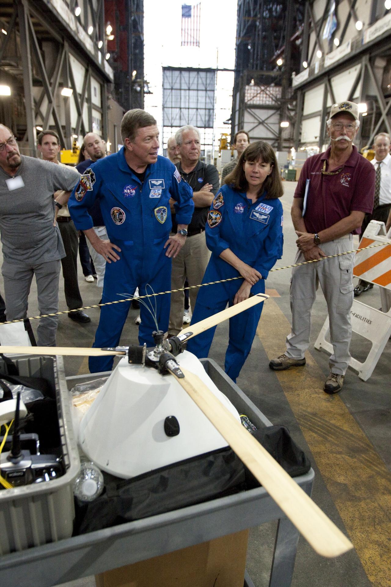 CAPE CANAVERAL, Fla. - Astronauts Mike Fossum and Cady Coleman look over a model capsule fit with rotor blades ahead of tests inside the Vehicle Assembly Building at NASA's Kennedy Space Center in Florida. The design would give a capsule the stability and control of a helicopter, but would not be powered. Instead, the wind passing over the rotors as the capsule descends would make the blades turn, a process called auto-rotation. The intent is to give real spacecraft a soft landing with enough control that they could touch down anywhere in the world, whether it be a runway or parking lot. In other words, wherever a helicopter could land, a spacecraft could land, too. Photo credit: NASA/Kim Shiflett