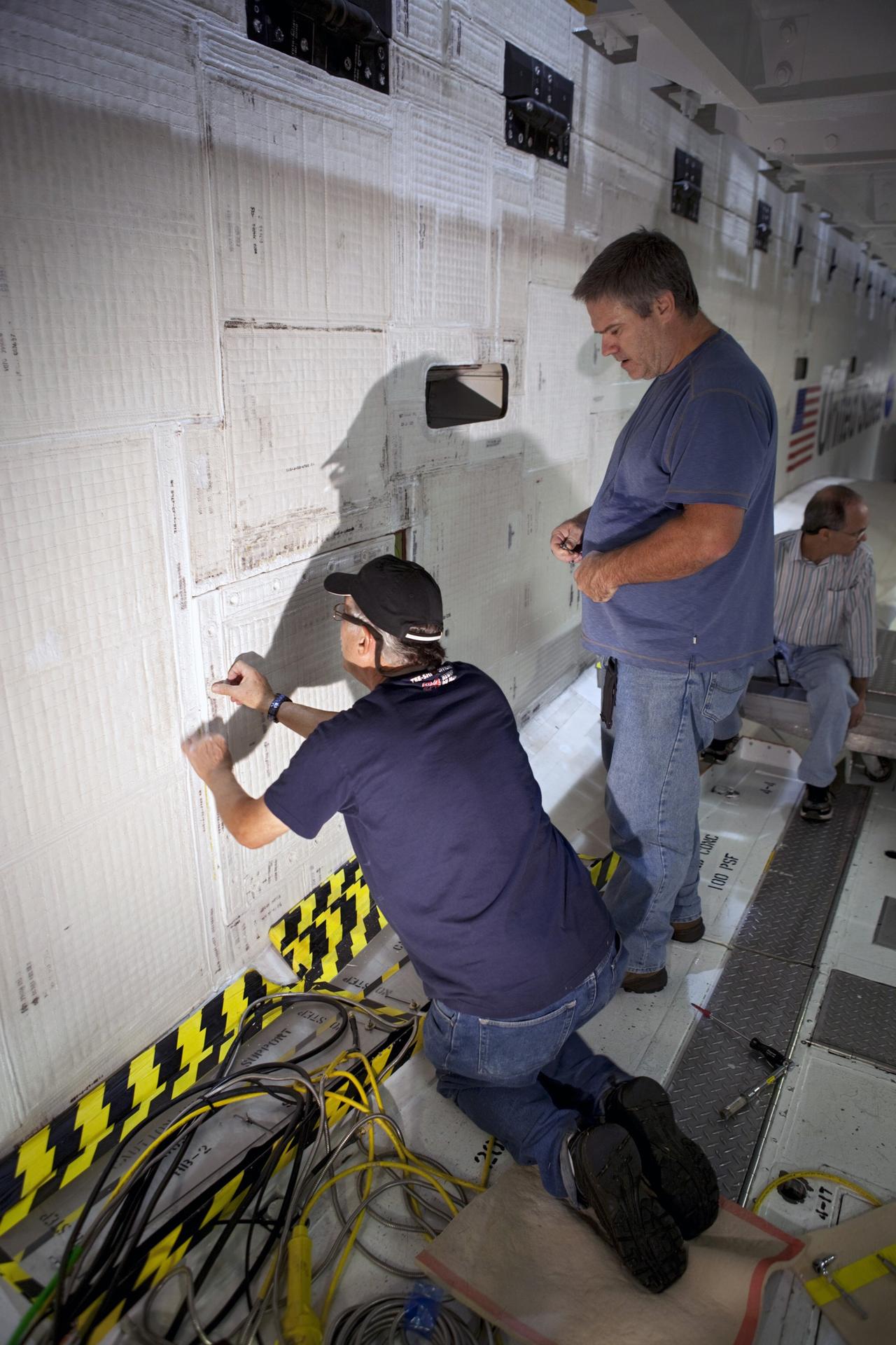 CAPE CANAVERAL, Fla. – Inside Orbiter Processing Facility-2 at NASA’s Kennedy Space Center in Florida, United Space Alliance technicians close space shuttle Atlantis’ midbody door for the final time. The orbiter is undergoing final preparations for its transfer to the Kennedy Space Center Visitor complex targeted for November. The work is part of Transition and Retirement of the remaining shuttle. Atlantis is being prepared for public display at the visitor complex. Over the course of its 26-year career, Atlantis spent 293 days in space during 33 missions. For more information, visit http://www.nasa.gov/transition. Photo credit: NASA/Dimitri Gerondidakis