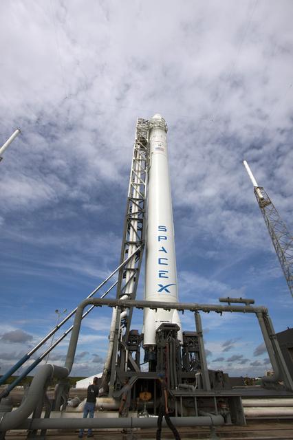 CAPE CANAVERAL, Fla. -- The Space Exploration Technologies Corp., or SpaceX, Falcon 9 rocket with Dragon capsule attached on top is lifted into the vertical position during a rollout demonstration test at Space Launch Complex-40 at Cape Canaveral Air Force Station in Florida. Preparations continue for NASA’s first Commercial Resupply Services, or CRS-1, mission to the International Space Station. The rollout to the pad for liftoff is planned for Sunday morning, Oct. 7. Liftoff from CCAFS is scheduled during an instantaneous window at 8:35 p.m. EDT Sunday evening. SpaceX CRS-1 is an important step toward making America’s microgravity research program self-sufficient by providing a way to deliver and return significant amounts of cargo, including science experiments, to and from the orbiting laboratory. To learn more, visit http://www.nasa.gov/mission_pages/station/living/launch/index.html. Photo credit: NASA/Jim Grossmann