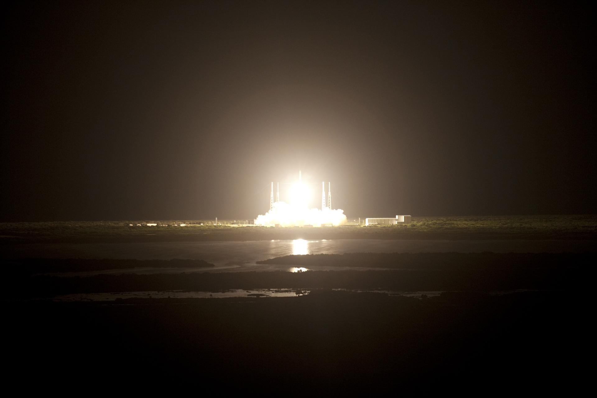 CAPE CANAVERAL, Fla. -- Space Launch Complex 40 on Cape Canaveral Air Force Station in Florida is illuminated by a Falcon 9 rocket as it lifts off at 8:35 p.m. EDT carrying a Dragon capsule to orbit. Space Exploration Technologies Corp., or SpaceX, built both the rocket and capsule for NASA's first Commercial Resupply Services, or CRS-1, mission to the International Space Station. SpaceX CRS-1 is an important step toward making America’s microgravity research program self-sufficient by providing a way to deliver and return significant amounts of cargo, including science experiments, to and from the orbiting laboratory. NASA has contracted for 12 commercial resupply flights from SpaceX and eight from the Orbital Sciences Corp. For more information, visit http://www.nasa.gov/mission_pages/station/living/launch/index.html. Photo credit: NASA/Gianni Woods