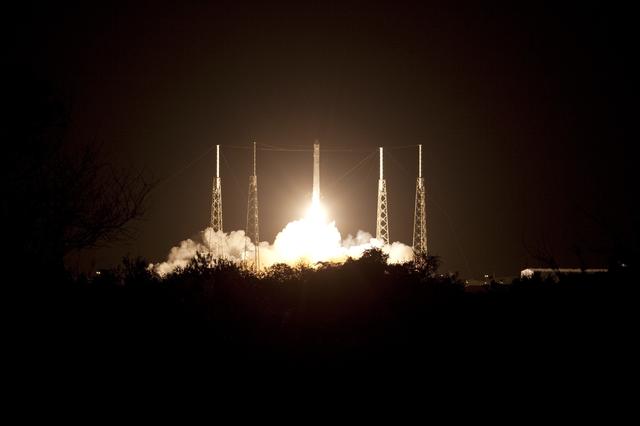 CAPE CANAVERAL, Fla. -- A Falcon 9 rocket lifts off Space Launch Complex 40 on Cape Canaveral Air Force Station in Florida at 8:35 p.m. EDT, carrying a Dragon capsule to orbit. Space Exploration Technologies Corp., or SpaceX, built both the rocket and capsule for NASA's first Commercial Resupply Services, or CRS-1, mission to the International Space Station. SpaceX CRS-1 is an important step toward making America’s microgravity research program self-sufficient by providing a way to deliver and return significant amounts of cargo, including science experiments, to and from the orbiting laboratory. NASA has contracted for 12 commercial resupply flights from SpaceX and eight from the Orbital Sciences Corp. For more information, visit http://www.nasa.gov/mission_pages/station/living/launch/index.html. Photo credit: NASA/Jim Grossmann