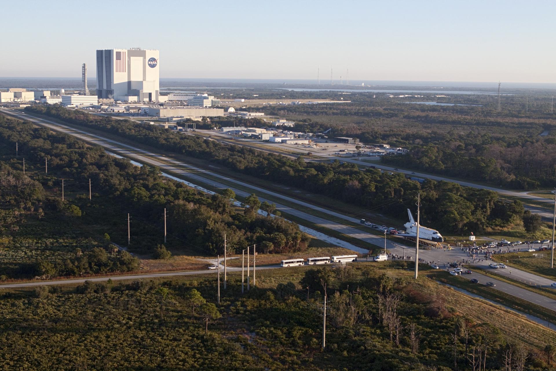 CAPE CANAVERAL, Fla. – Space shuttle Atlantis is transported along Kennedy Parkway at NASA's Kennedy Space Center in Florida on its 10-mile journey to the Kennedy Visitor Complex where it will be put on public display. As part of transition and retirement of the Space Shuttle Program, Atlantis is to be displayed at Kennedy's Visitor Complex beginning in the summer of 2013. Over the course of its 26-year career, Atlantis traveled 125,935,769 miles during 307 days in space over 33 missions. For more information, visit http://www.nasa.gov/transition Photo credit: NASA/ Kim Shiflett