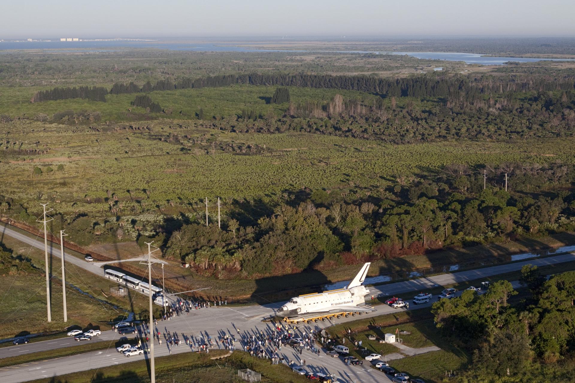 CAPE CANAVERAL, Fla. – Space shuttle Atlantis is transported along Kennedy Parkway at NASA's Kennedy Space Center in Florida on its 10-mile journey to the Kennedy Visitor Complex where it will be put on public display. As part of transition and retirement of the Space Shuttle Program, Atlantis is to be displayed at Kennedy's Visitor Complex beginning in the summer of 2013. Over the course of its 26-year career, Atlantis traveled 125,935,769 miles during 307 days in space over 33 missions. For more information, visit http://www.nasa.gov/transition Photo credit: NASA/ Kim Shiflett