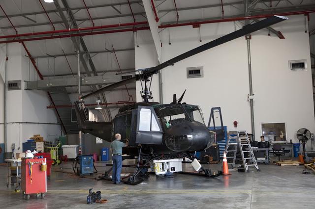 CAPE CANAVERAL, Fla. – Near the Shuttle Landing Facility at NASA's Kennedy Space Center in Florida, a space agency team installed and tested hazard avoidance instrumentation on a Huey helicopter. Led by the Johnson Space Center and supported by Jet Propulsion Laboratory and Langley Research Center, the Autonomous Landing Hazard Avoidance Technology, or ALHAT, laser system provides a planetary lander the ability to precisely land safely on a surface while detecting any dangerous obstacles such as rocks, holes and slopes. Just north of Kennedy's Shuttle Landing Facility runway, a rock- and crater-filled planetary scape has been built so engineers can test the ability to negotiate away from risks. Photo credit: NASA/Dmitri Gerondidakis