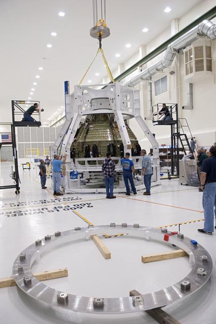 CAPE CANAVERAL, Fla. – Technicians lower a special fixture around an Orion spacecraft inside the high bay of the Operations & Checkout Building at NASA's Kennedy Space Center in Florida. The fixture is designed to enable precise pre-launch processing of the Orion spacecraft. An Orion capsule is being prepared to make a flight test in 2014 on a mission that will not carry any astronauts. Photo by Tim Jacobs